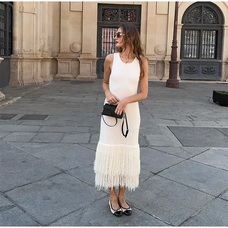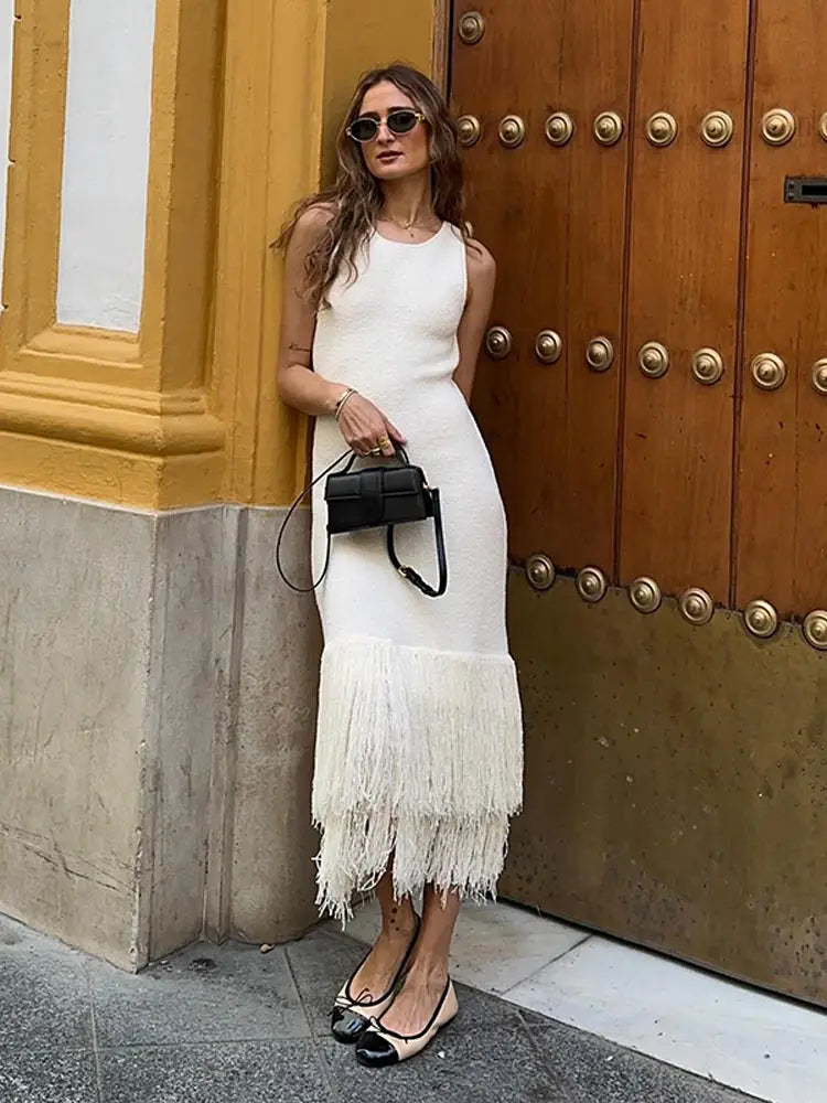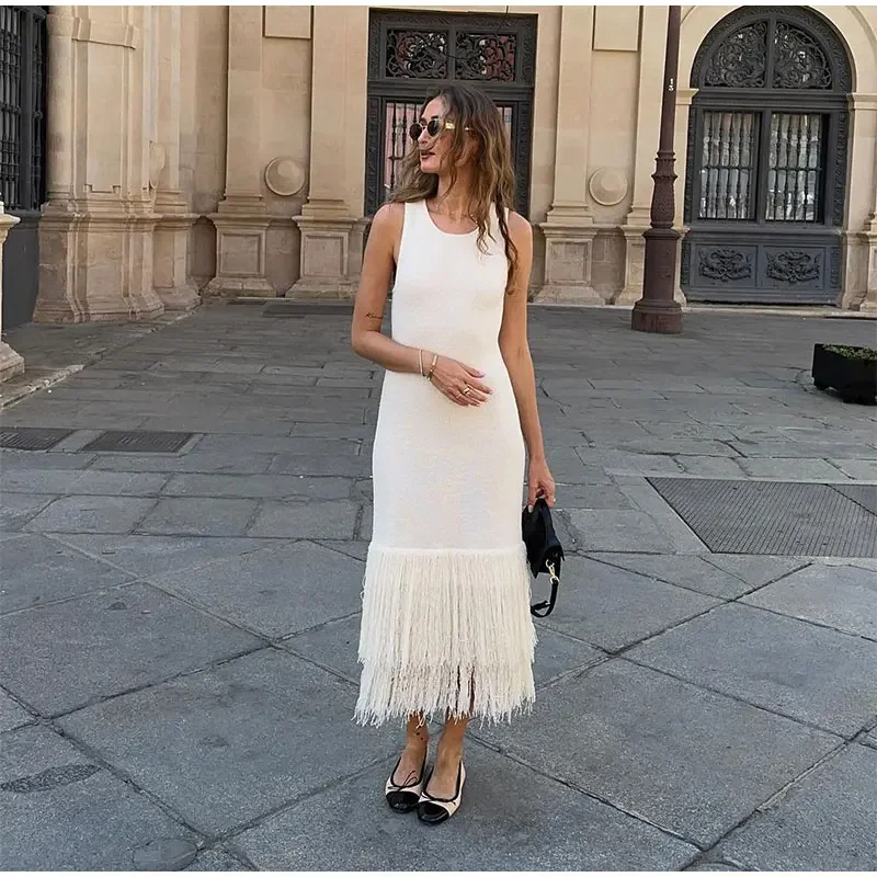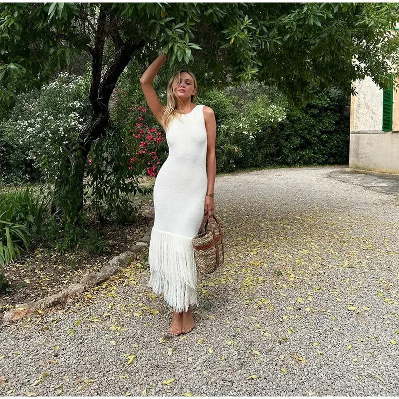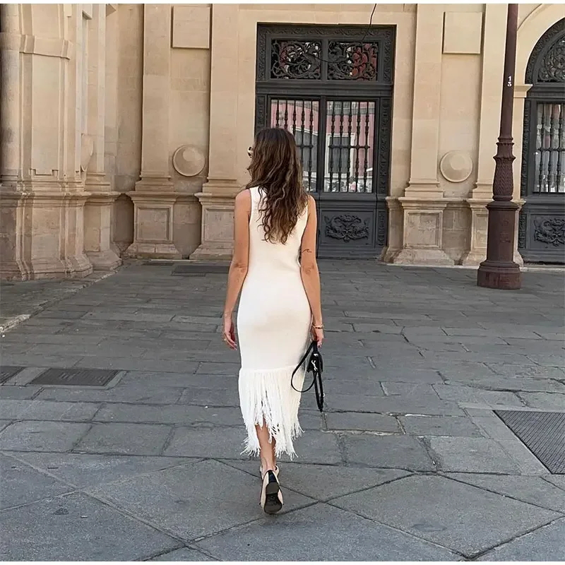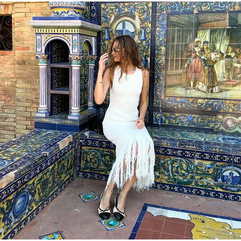 LIZAKOSHT - Elegant Tassels Hem Patchwork Women Knit Dress Chic O-neck Sleeveless Bodycon Midi Dresses 2024 Summer Lady Beach Vacation Robes