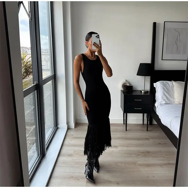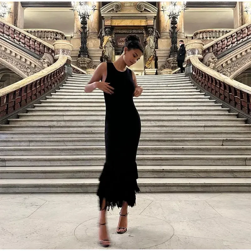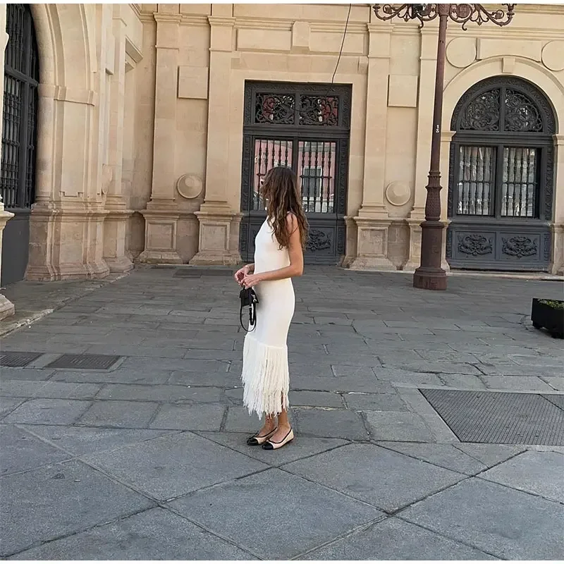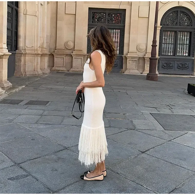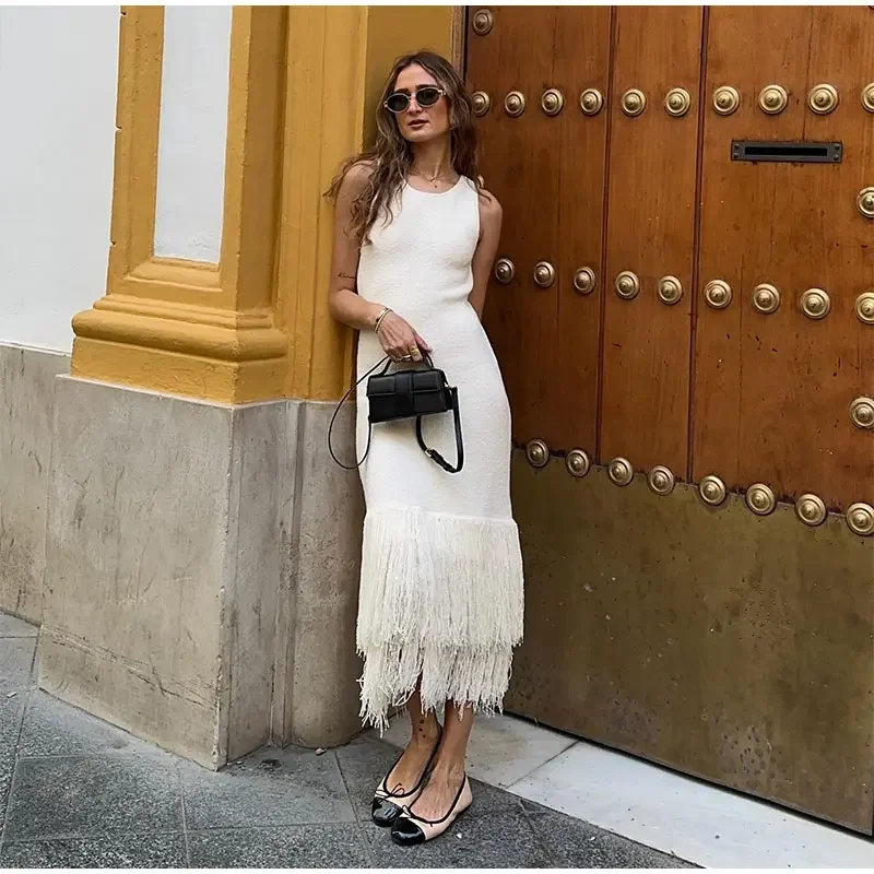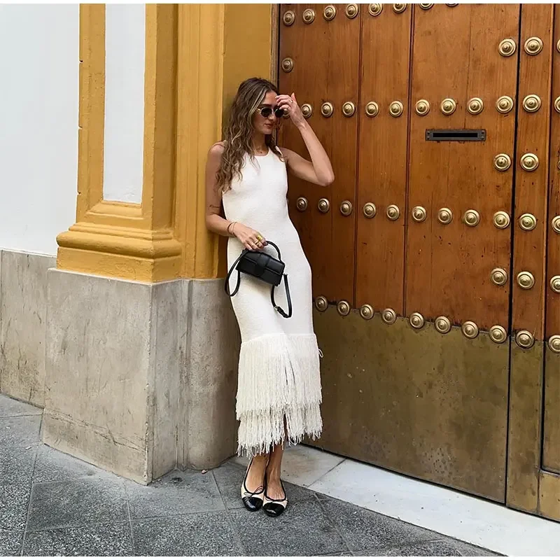 LIZAKOSHT - Elegant Tassels Hem Patchwork Women Knit Dress Chic O-neck Sleeveless Bodycon Midi Dresses 2024 Summer Lady Beach Vacation Robes