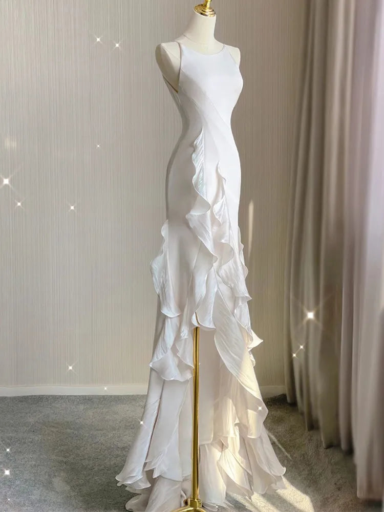 LIZAKOSHT - Elegant White Round Neck Slim Fit Sleeveless Women Wedding Dress Evening Party Gown with Ruffles Vestidos De Novia