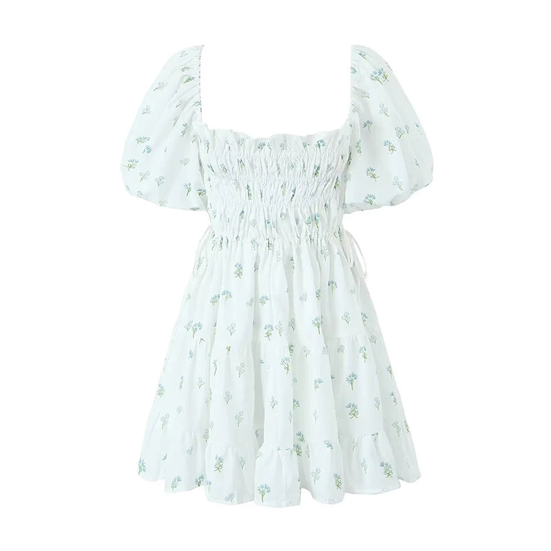 Elegant Women Puff Sleeve Elastic Waist Floral Print Dress Short Summer Robe