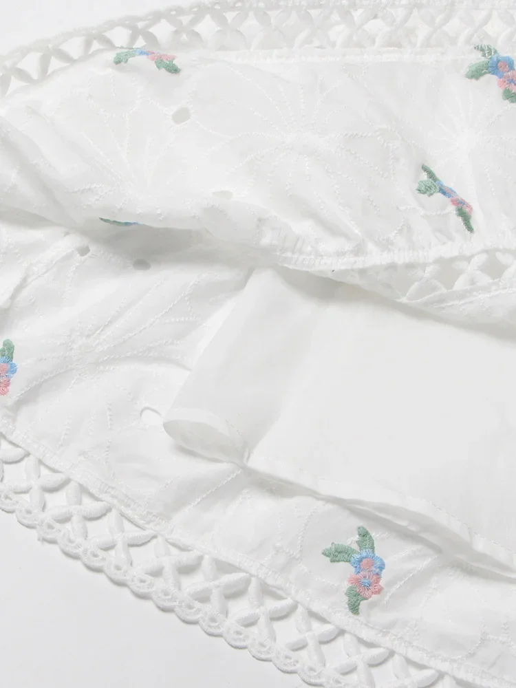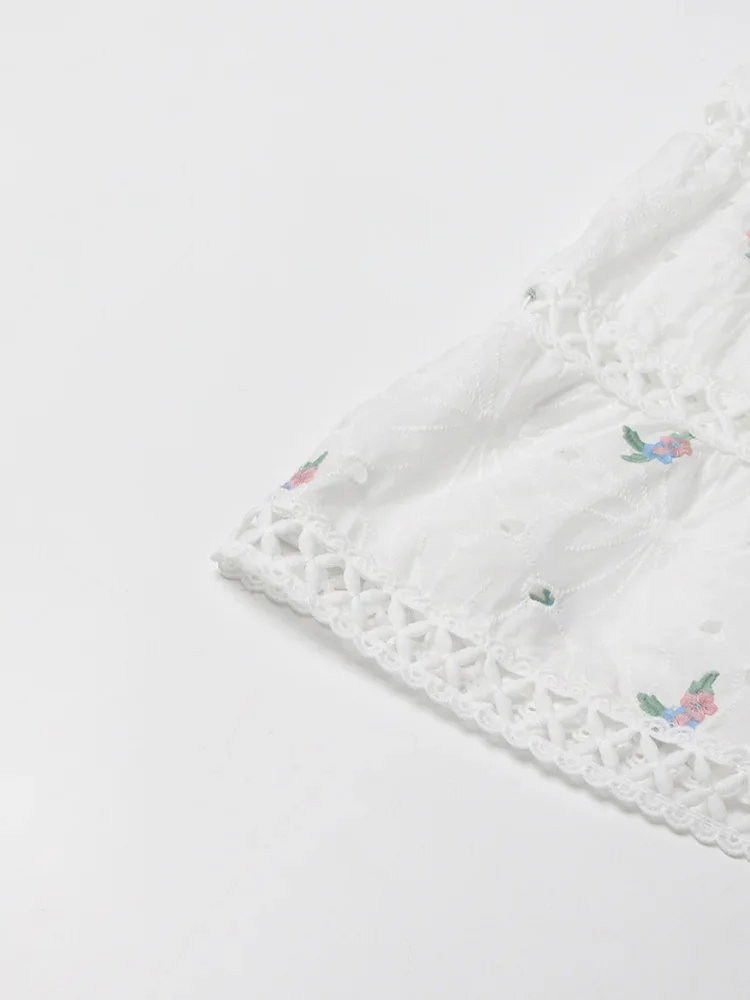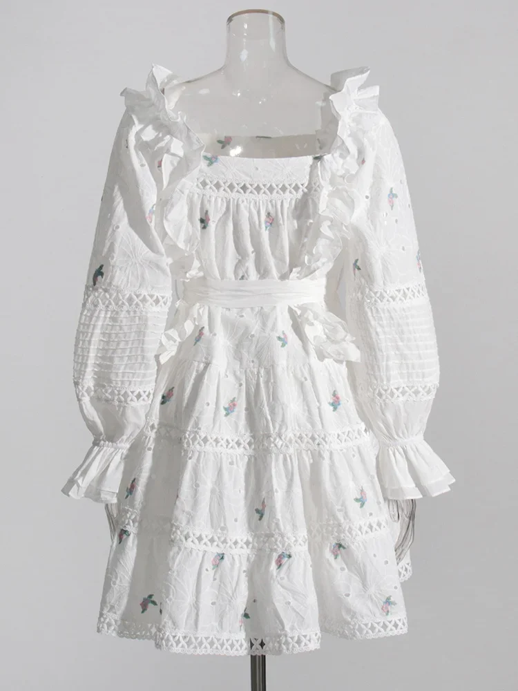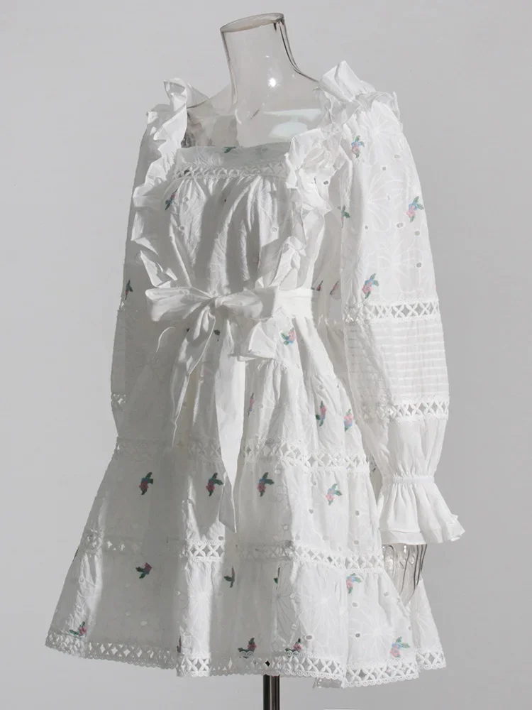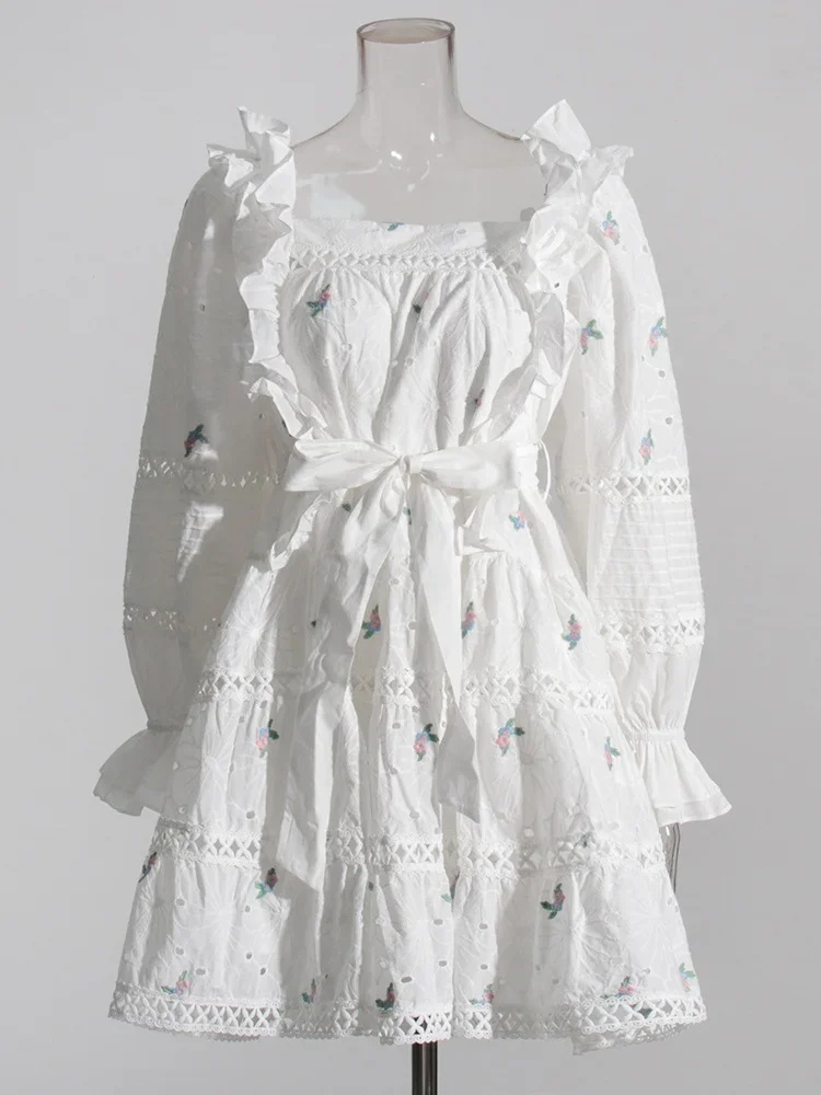 LIZAKOSHT - Embroidery Hollow Out Mini Dresses For Women Square Collar Puff Sleeve High Waist Printing Lace Up Dress Female Summer