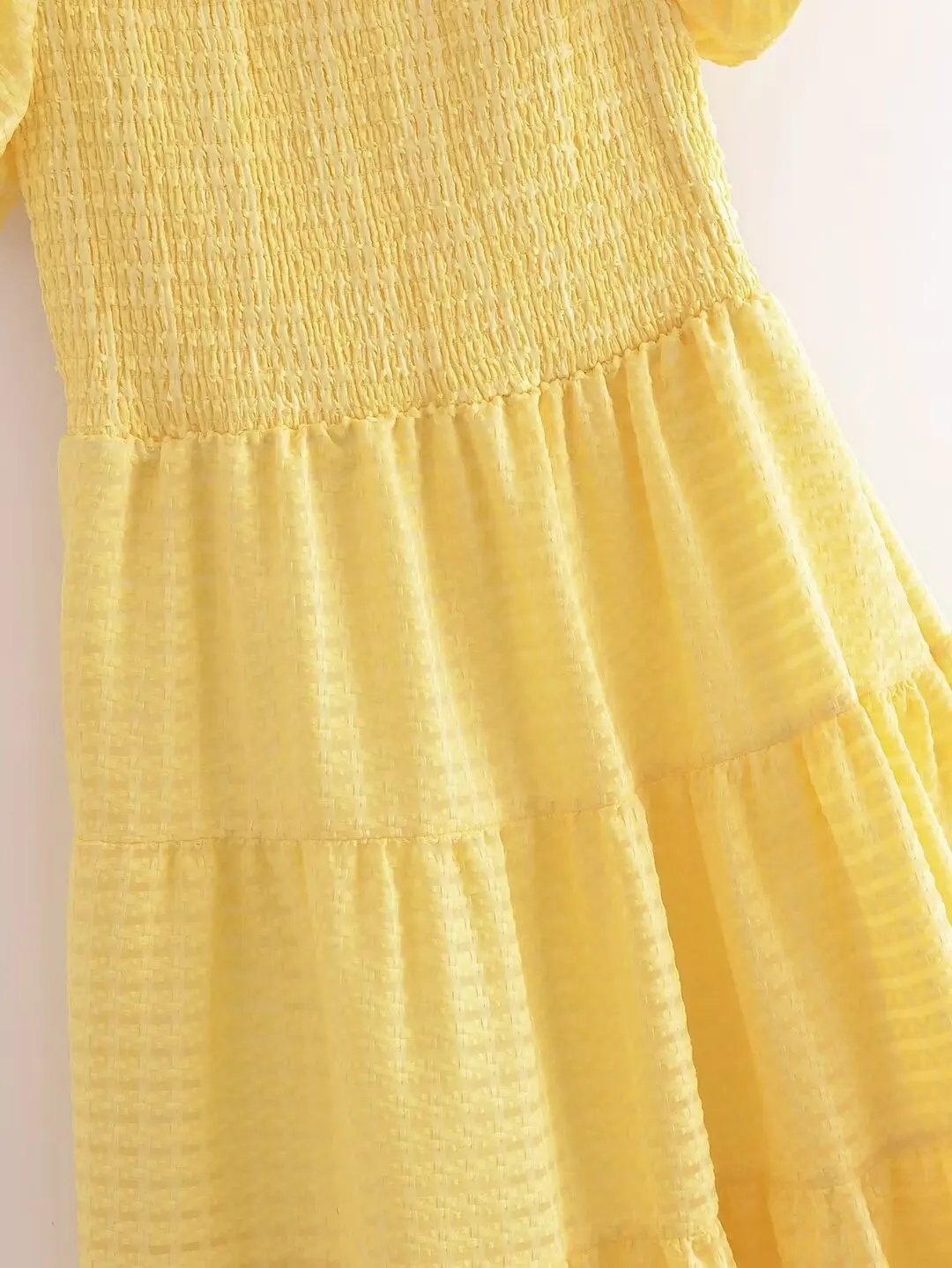 LIZAKOSHT - Europe and America Wind Spring Women's New Yellow V-neck Printed Short-sleeved Dress Fluffy Skirt