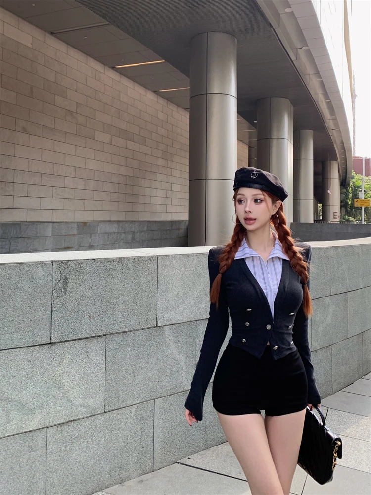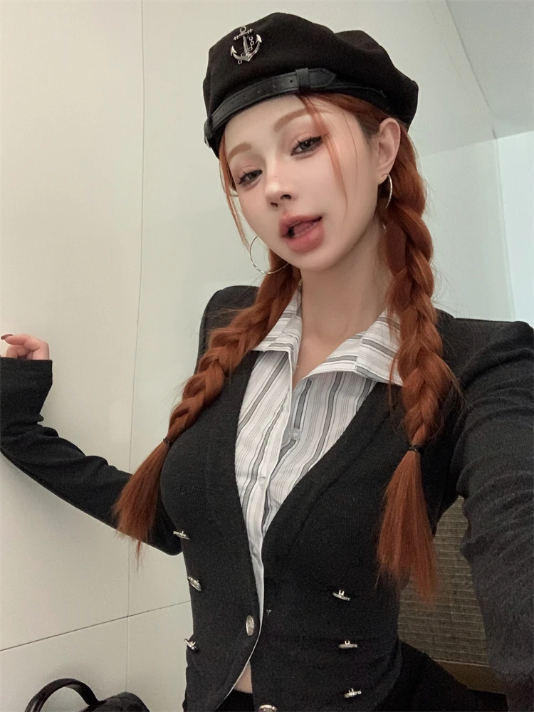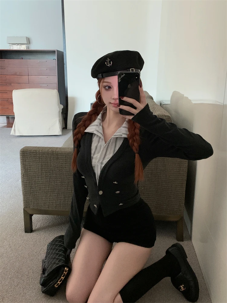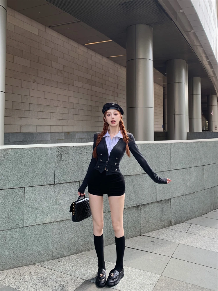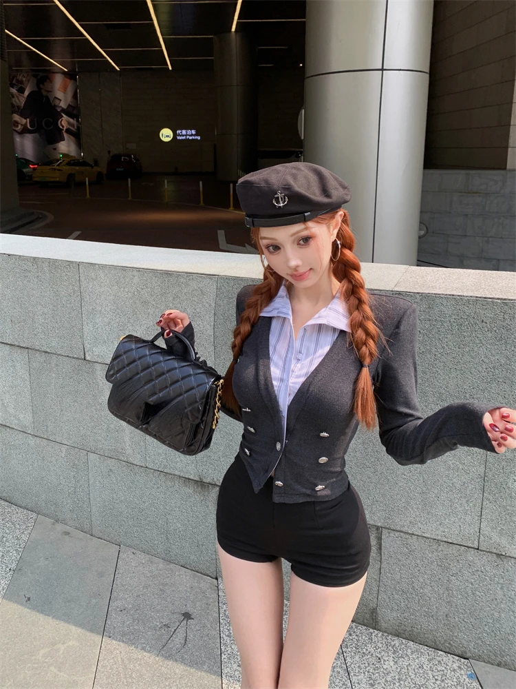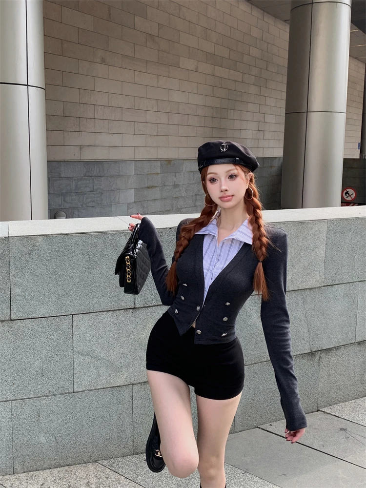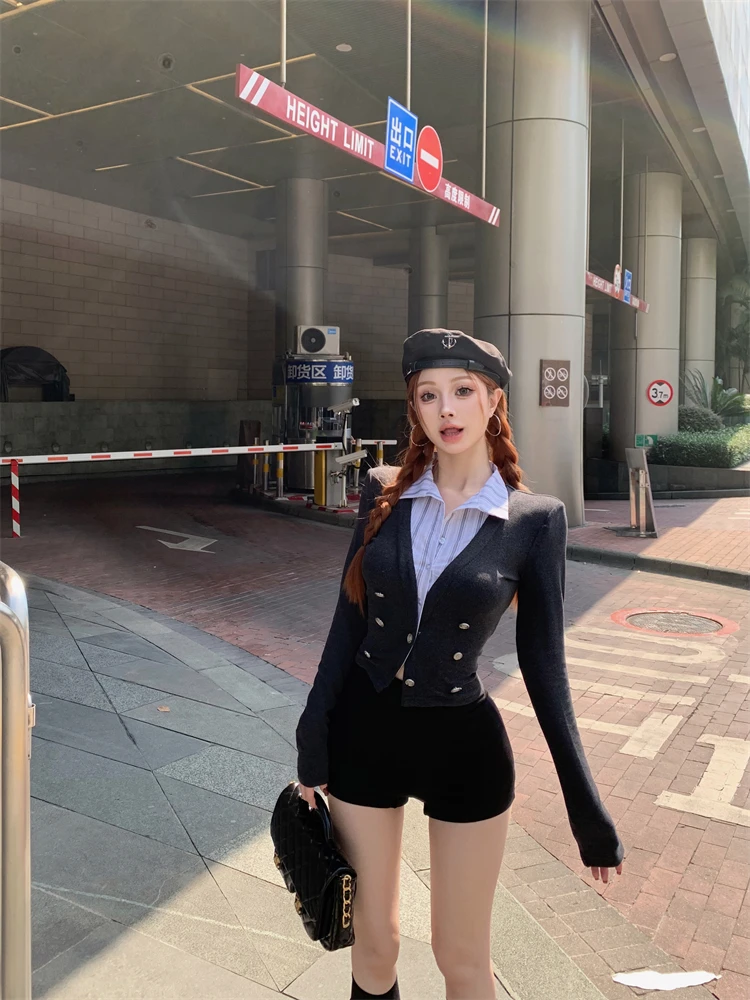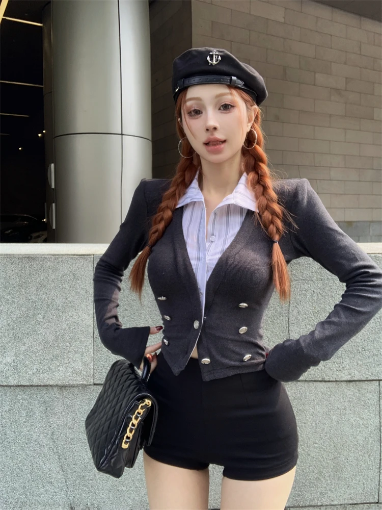 LIZAKOSHT - Fake Two-piece Multi-button Casual Long-sleeved Cardigan Women 2024 Autumn New Polo Collar Contrast Color Patchwork Knitted Tops
