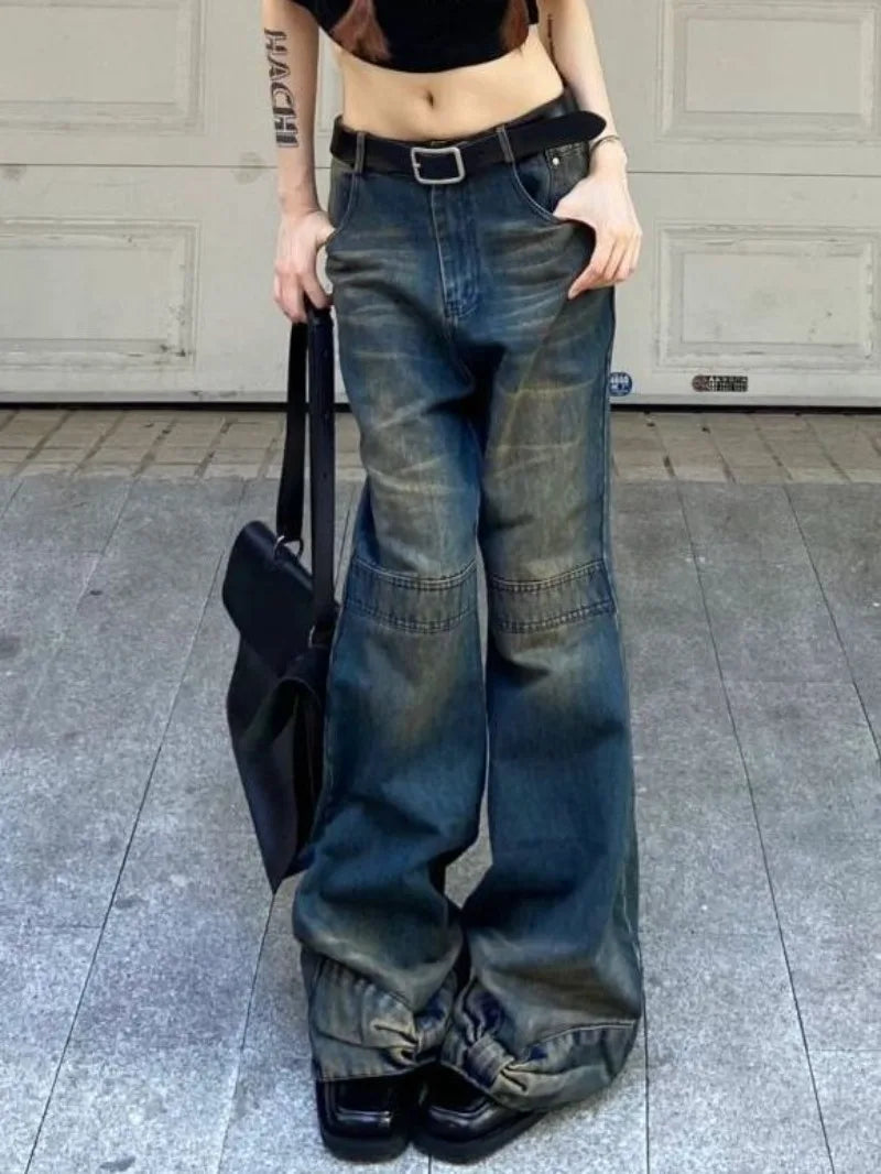 LIZAKOSHT - Fashion Bow Design Micro Flared Jeans Oversized Retro Streetwear Casual High Waist Washed Straight Leg Loose Wide Leg Pants
