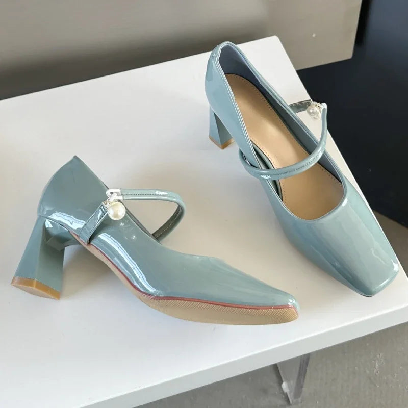 LIZAKOSHT  -  Fashion Chunky Mary Jane Shoe Patent Leather Elegant Dress Shoes Pearl Buckle Comfort Spring Square Toe High Heels Female Pumps