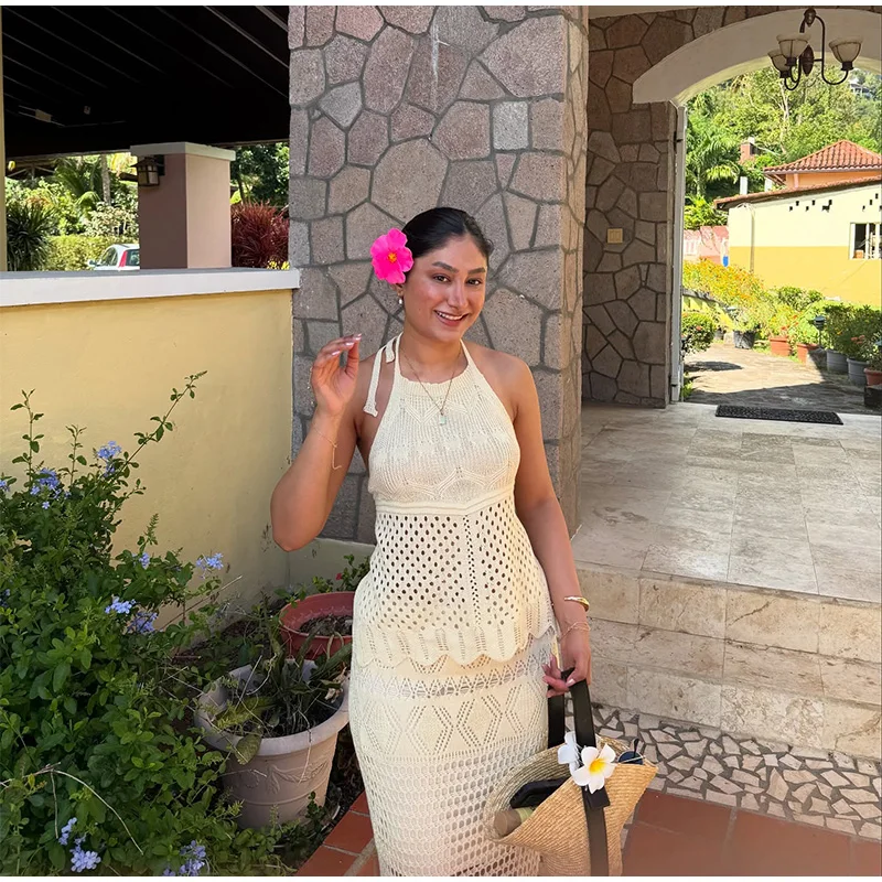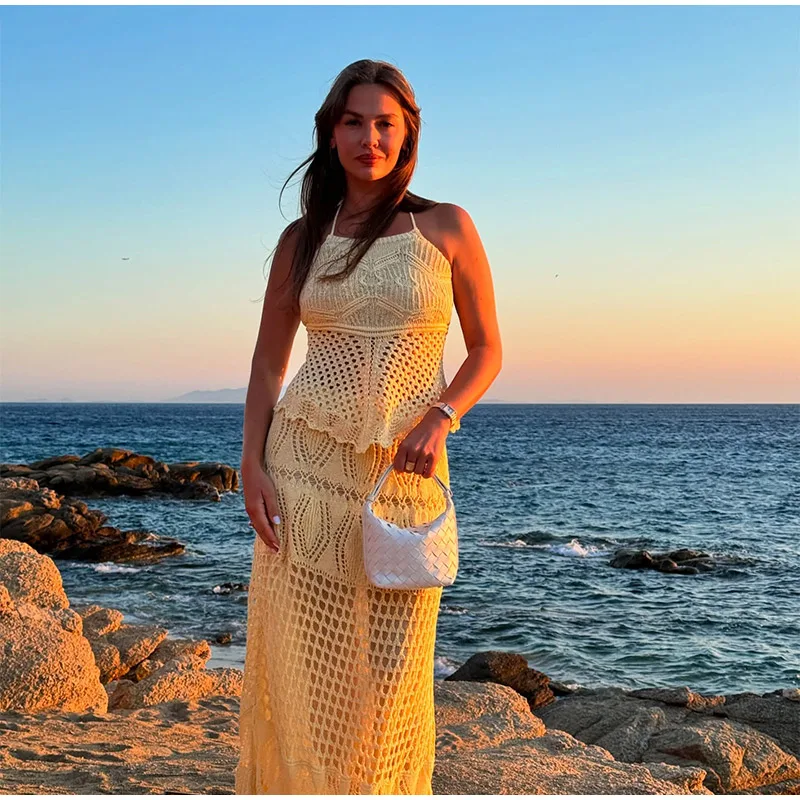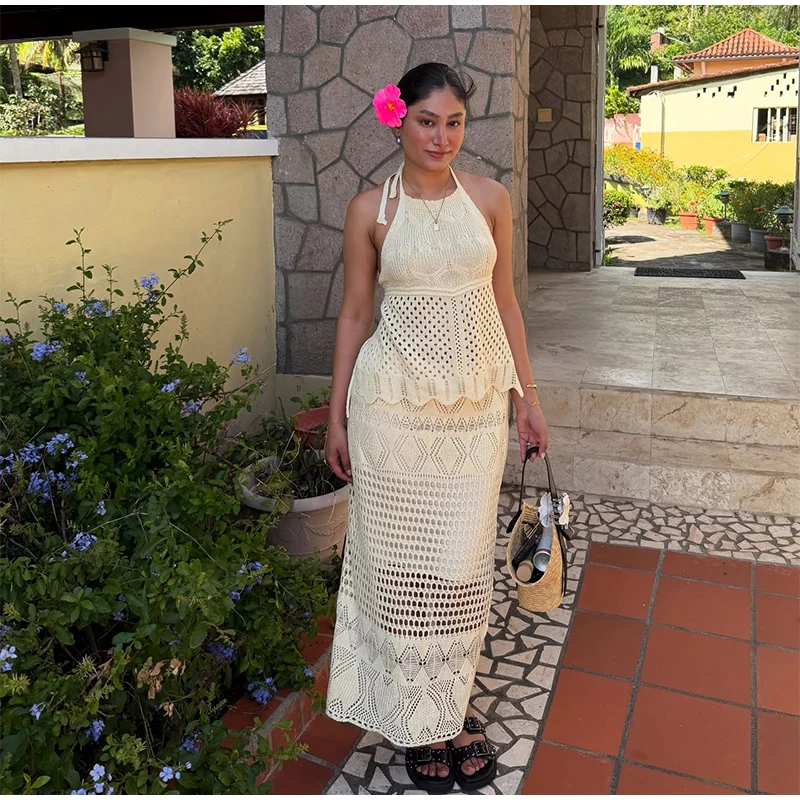 LIZAKOSHT  -  Fashion Crochet Women's Two Piece Set Halter Lace Up  Hollow Out Vest Pattern Long Skirt 2025 Summer Knit Beach Ladies Outfits