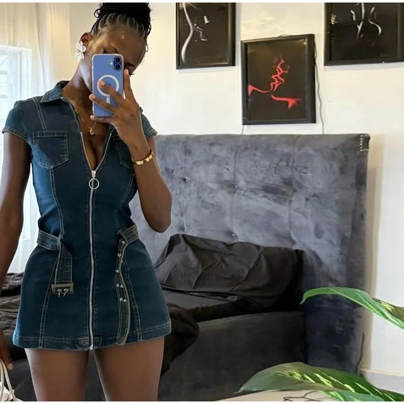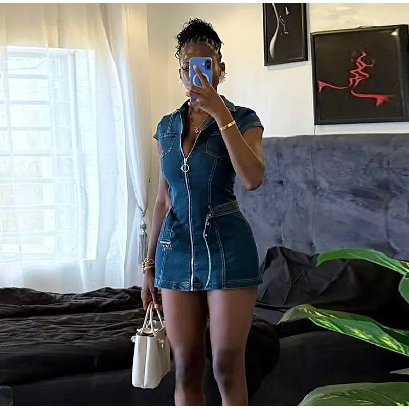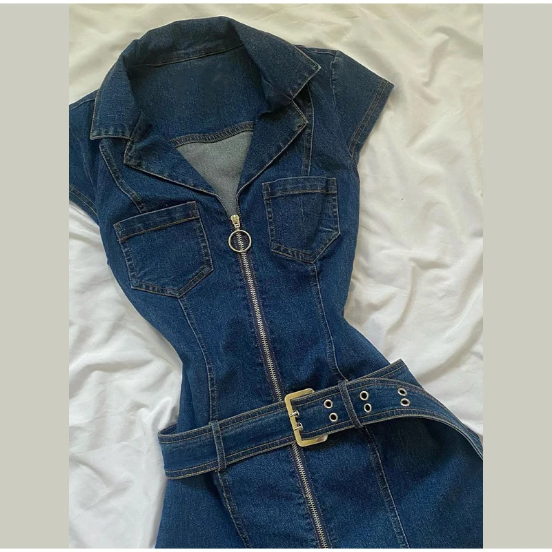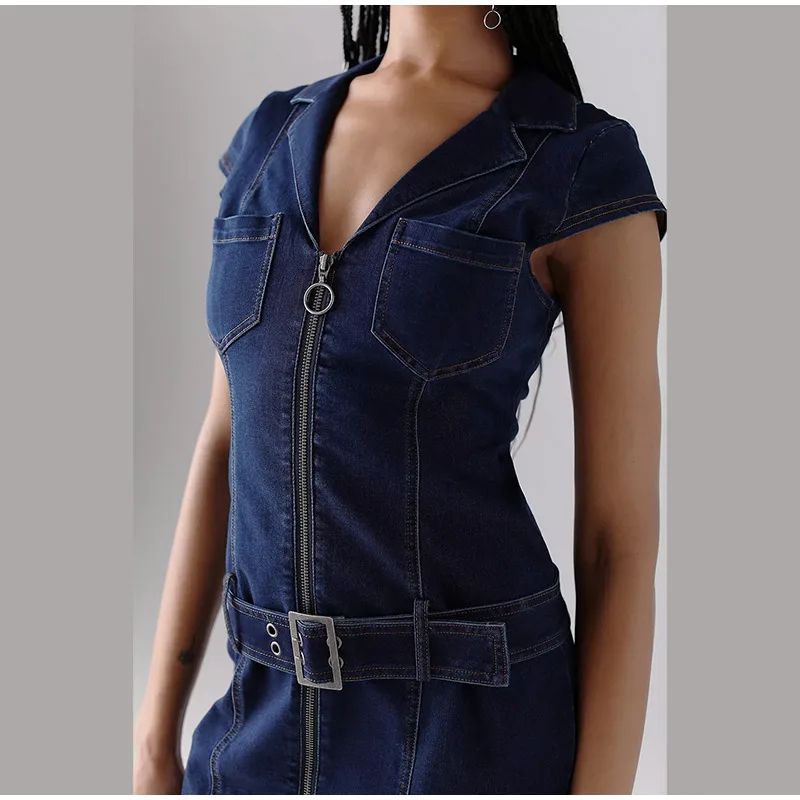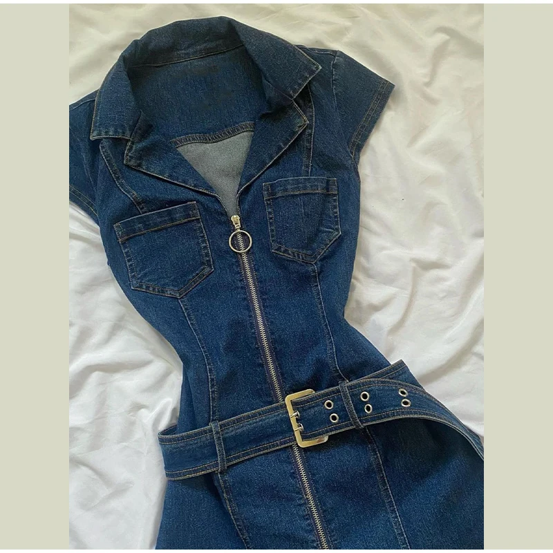 LIZAKOSHT  -  Fashion Denim Short Dress For Women Turn-down Collar Sleeveless Zipper Belt Vestidos 2025 Summer Elegant Female Casual Dresses