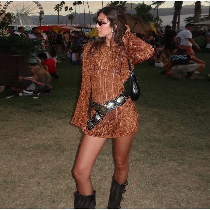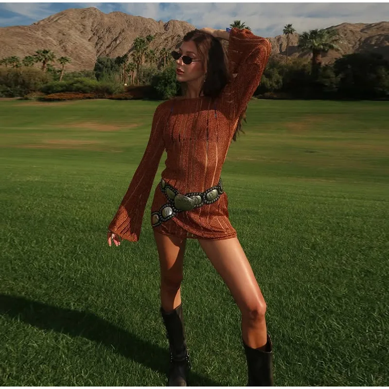 LIZAKOSHT - Fashion Knitted Striped Short Dress For Women O-neck Flare Sleeve Backless Lace Up Dresses 2025 Summer Chic Lady beach Vestidos
