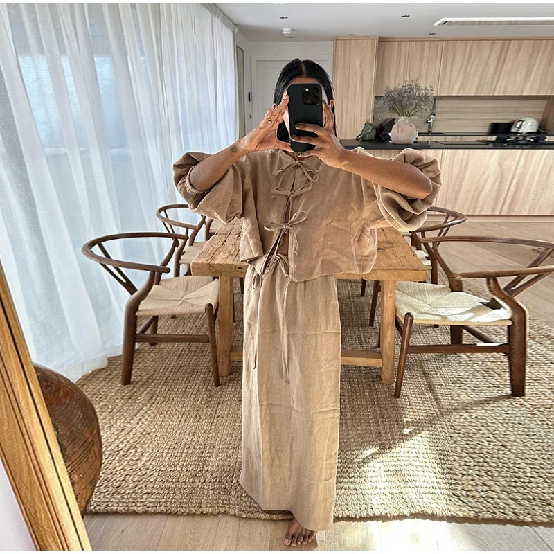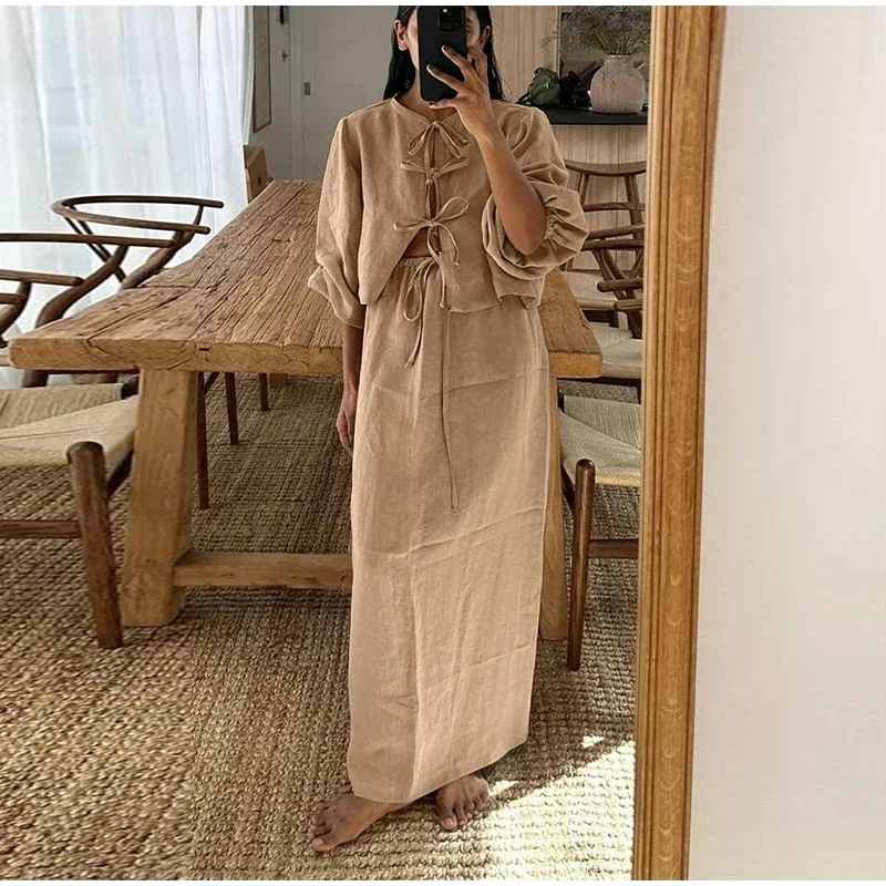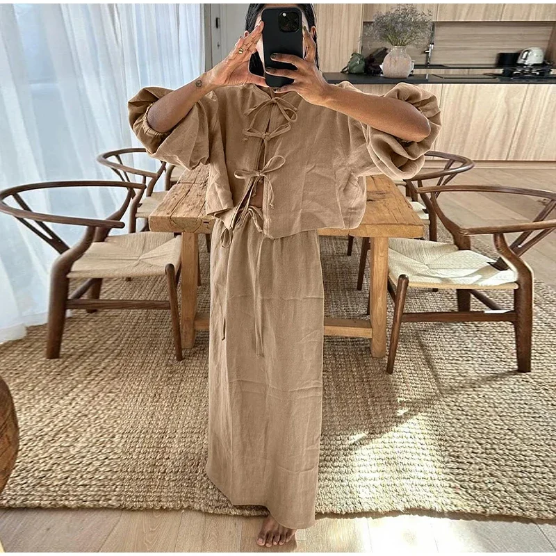LIZAKOSHT - Fashion O-neck Lace-up Shirt Skirt Sets Lady Causal Long Lantern Sleeves Maxi Skirt Suits 2024 Loose High Street 2 Piece Outfit