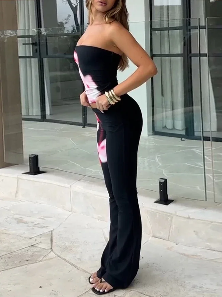 LIZAKOSHT  -  Fashion Patchwork 2 Piece Set Women Off Shoulder Backless Strapless Tops+Straight Pants Versatile Style Streetwear