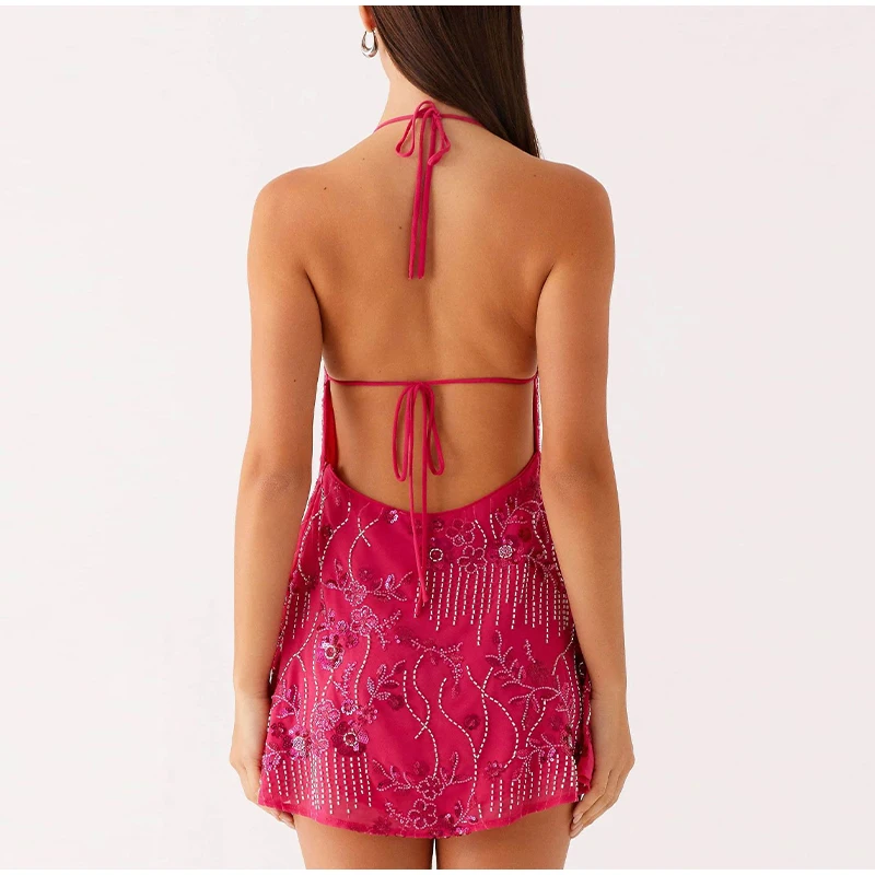 LIZAKOSHT - Fashion Print Beading Short Dress For Women Halter Sleeveless Lace Up Backless Vestidos 2025 Summer Elegant Lady Beach Dresses