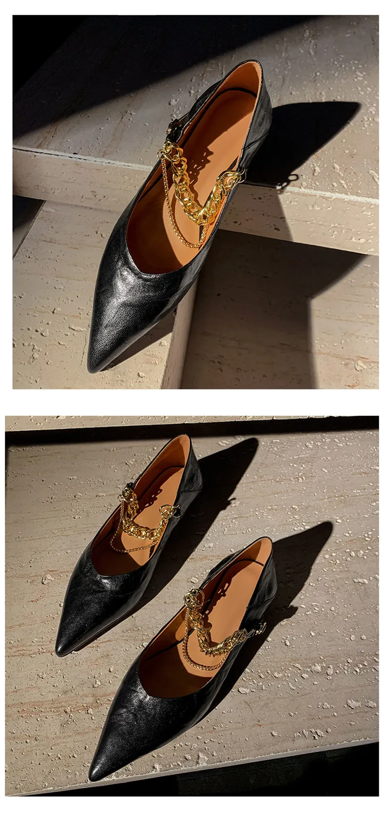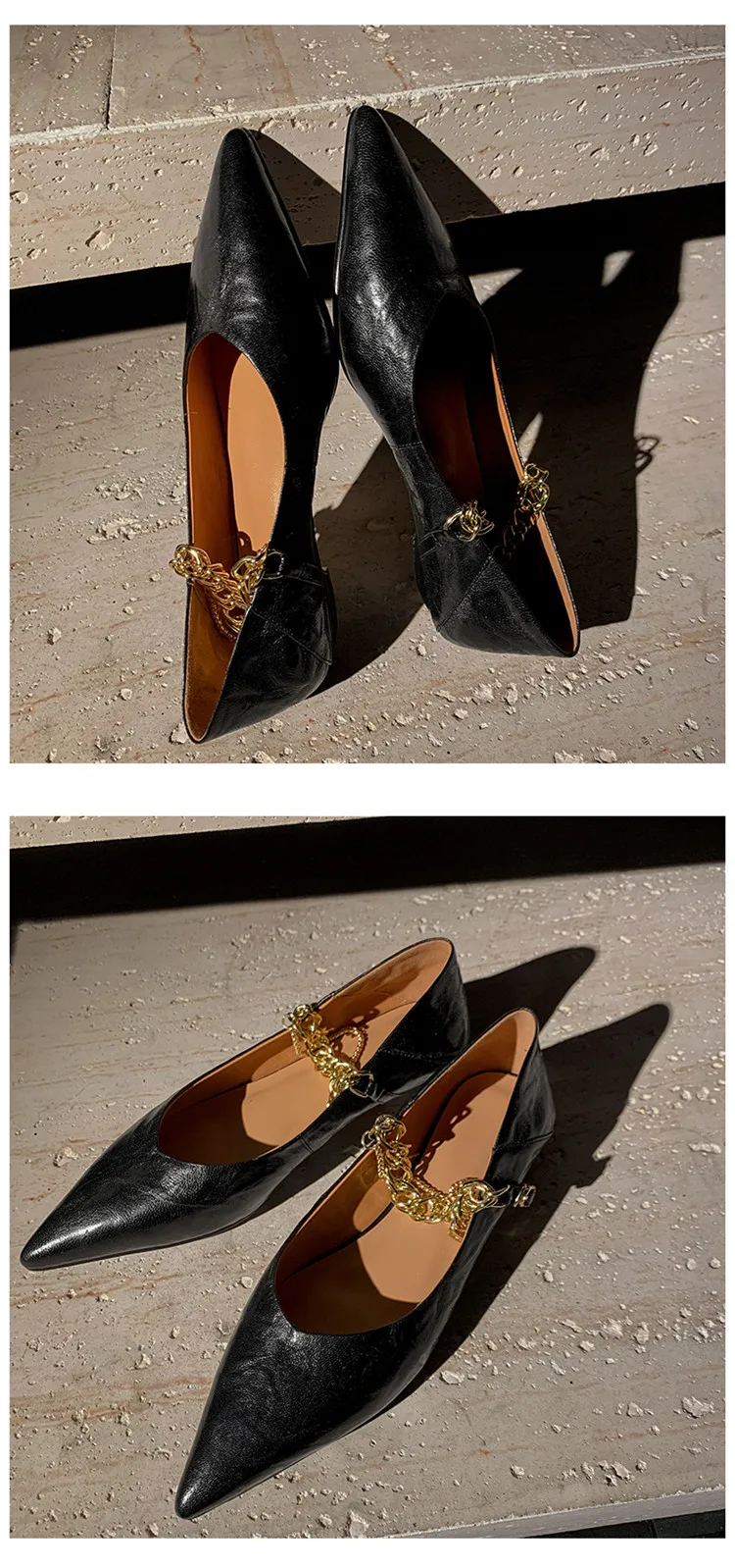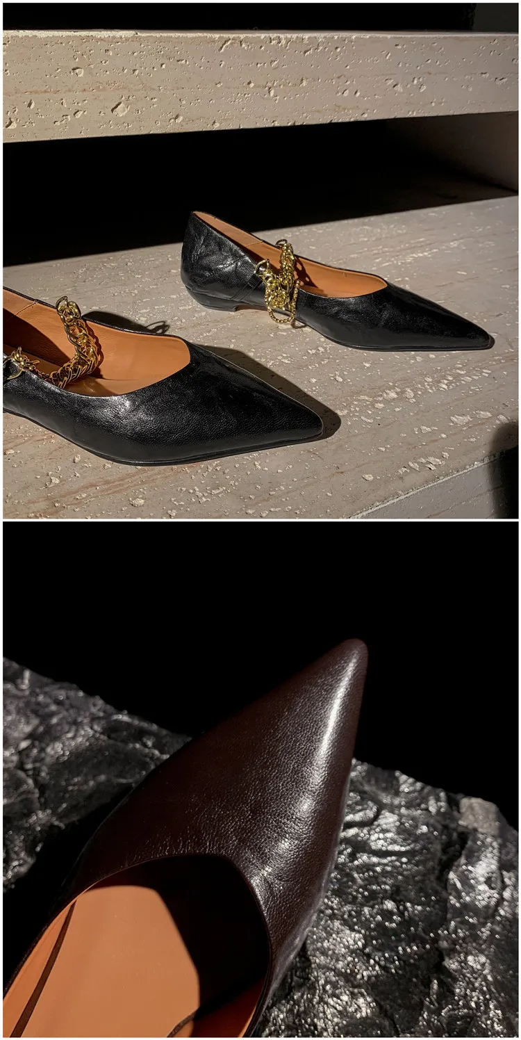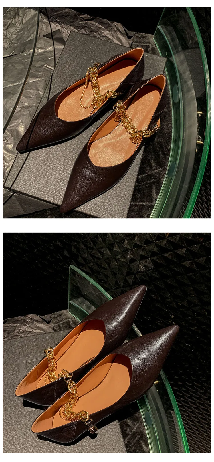 LIZAKOSHT - Fashion Pumps New High Quality Genuine Leather Chain Pointed Shallow Mouth Low Heel Women's Shoes Modern Commuter Shoes