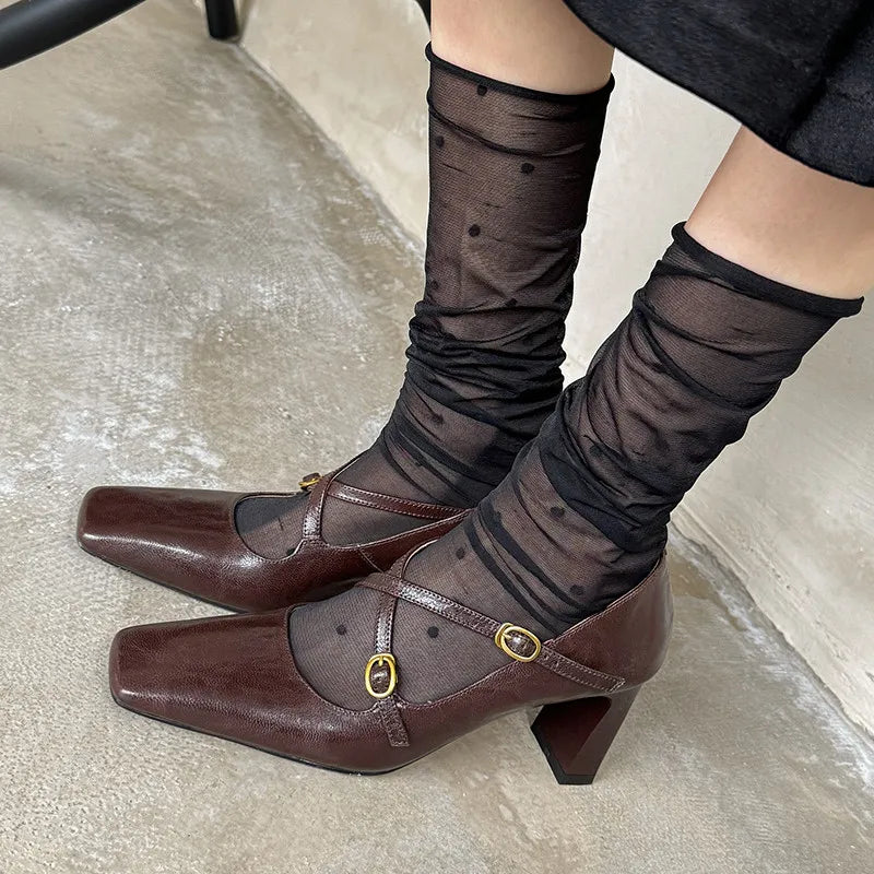 LIZAKOSHT - Fashion Pumps New High Quality Genuine Leather Square Head Cross Buckle High Heels Mary Janes Commuter Women's Shoes