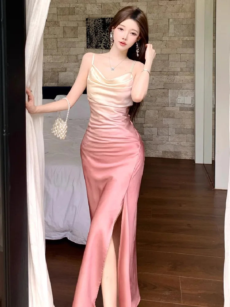 LIZAKOSHT - Fashion Sexy Dresses Women Elegant Sleeveless Slash Neck Split Ruched Backless Gradient Dresss Party Female Club