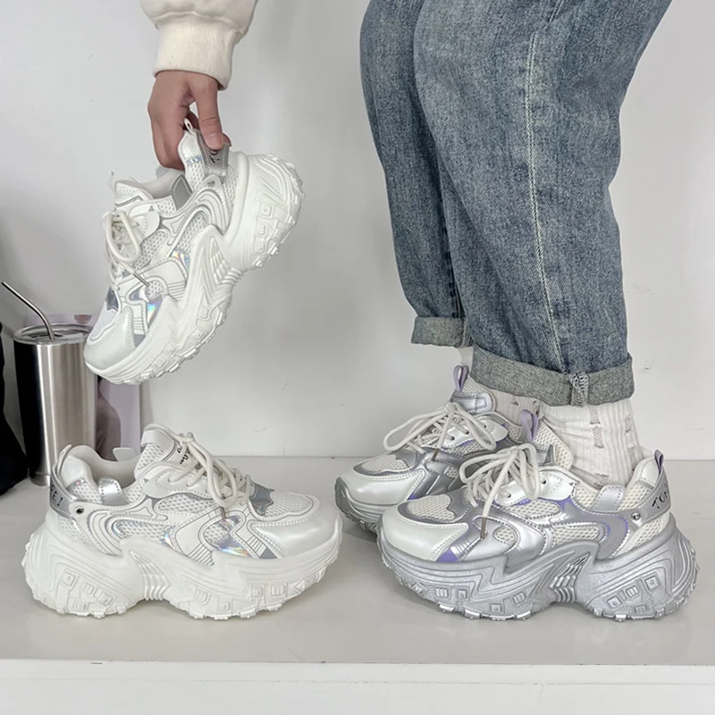 LIZAKOSHT - Fashion Silver Chunky Sneakers Women Autumn Lace Up Platform Sports Shoes Woman Thick Bottom Non Slip Walking Shoes Ladies