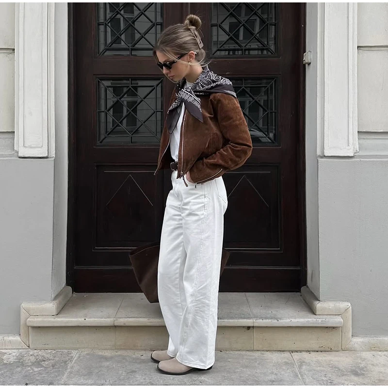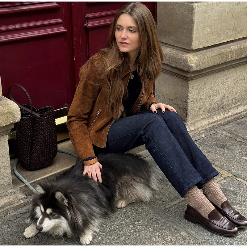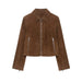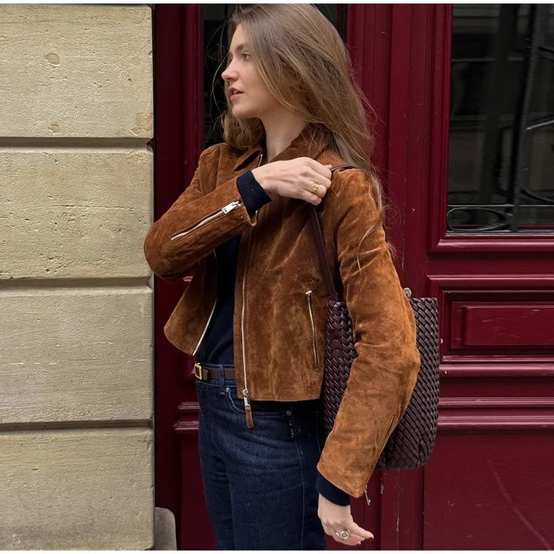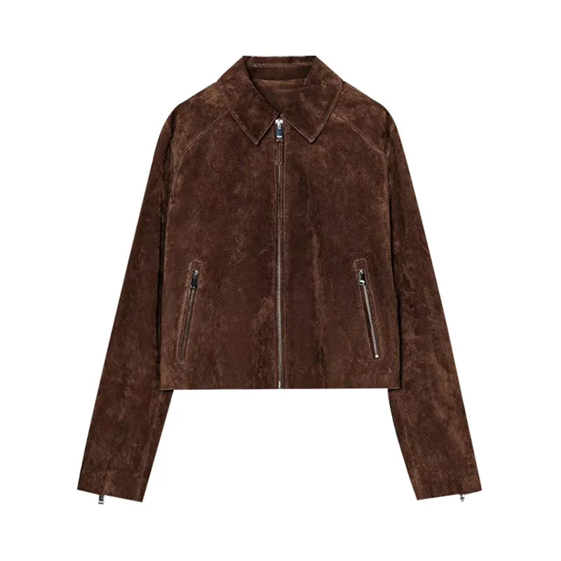 LIZAKOSHT  -  Fashion Suede Short Jackets Women Vintage Lapel Zippers Long Sleeve Pocket Jacket Coat 2025 New Autumn Winter Casual Streetwear