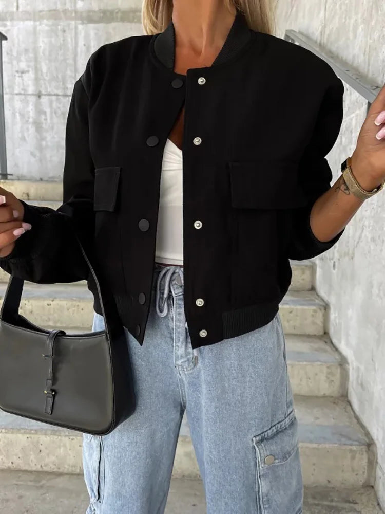 LIZAKOSHT - Fashion Women Autumn Winter Jackets Long Sleeve Stand Collar Loungewear Coats Simple Solid Stand Collar Cardigan Outerwear