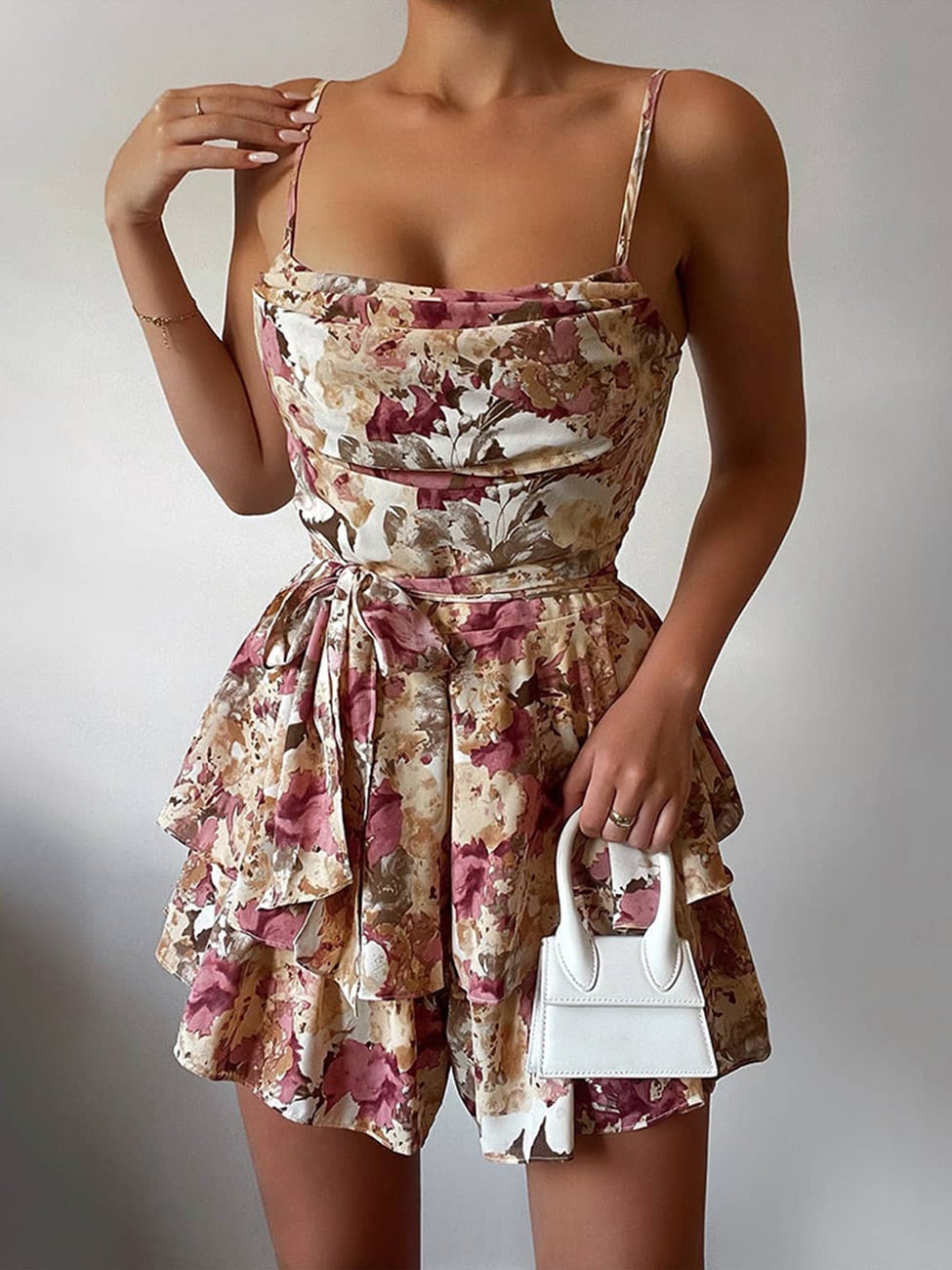 Lizakosht fashion women foral print cowl neck layered Ruffles Romper female overalls summer holiday beach spaghetti strap playsuit rompers