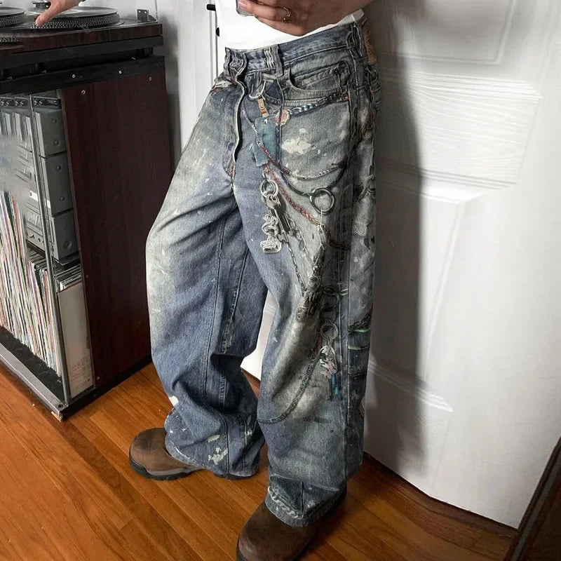 LIZAKOSHT - Fashion Women Washed Denim Cargo Pants Pockets Chain Print Straight Jeans Loose Trousers Cool Hiphop Lady Baggy Pants Streetwear