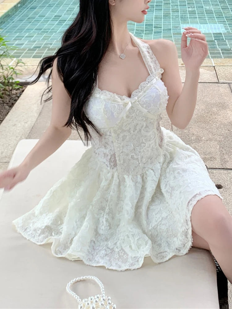 LIZAKOSHT -  French Lace Mesh Short Dress Women Casual Floral Dress Party Even Lady Slim Sexy One Piece Dress Korean 2024 Summer