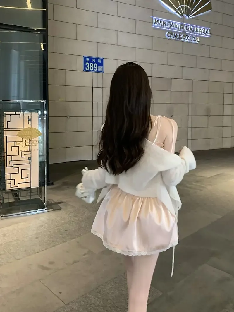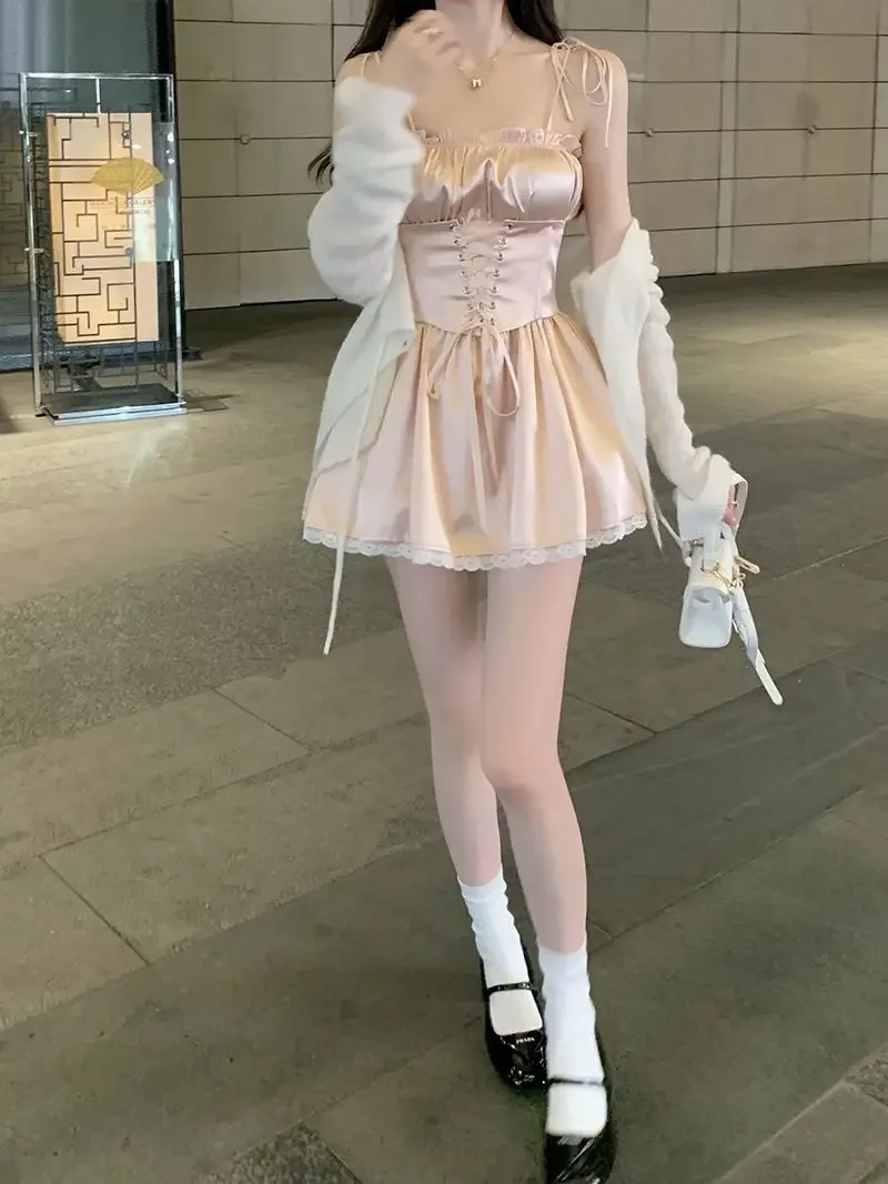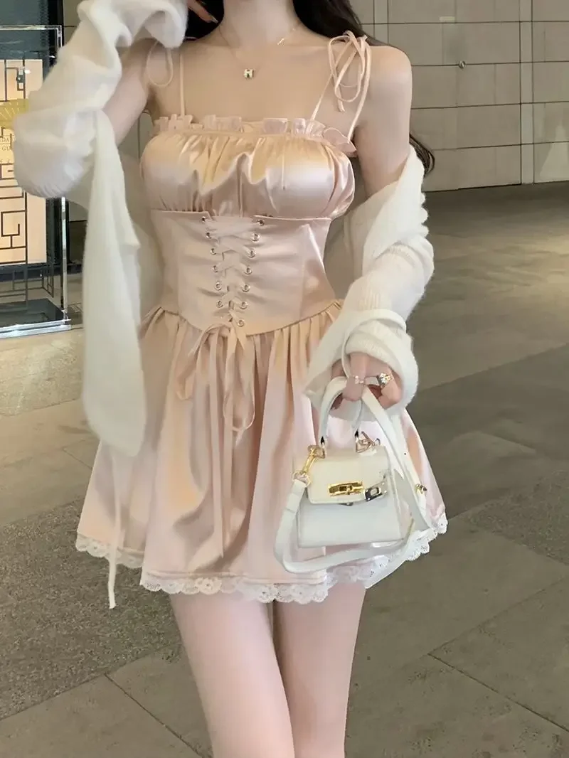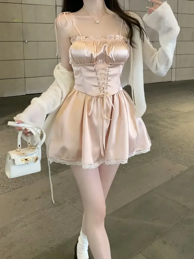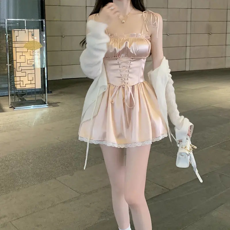 LIZAKOSHT  -  French Sweet Ins Strap Waist Design Suspender Skirt Splicing Slim Lace