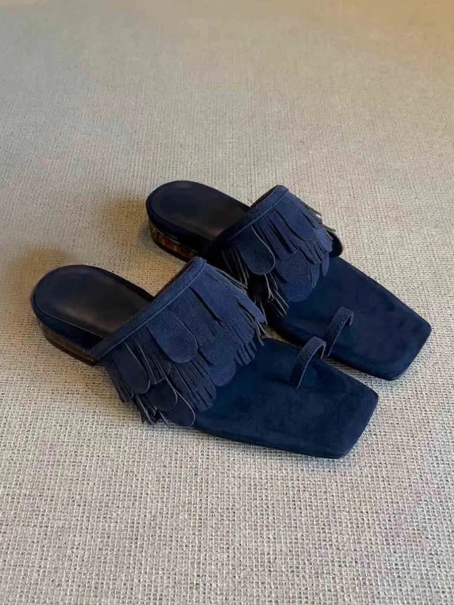 LIZAKOSHT - Fringe Brown Flip Flops Slippers Square Heels Peep Toe Suede Genuine Leather Sandals Summer Women's Vocation Fashion Shoes