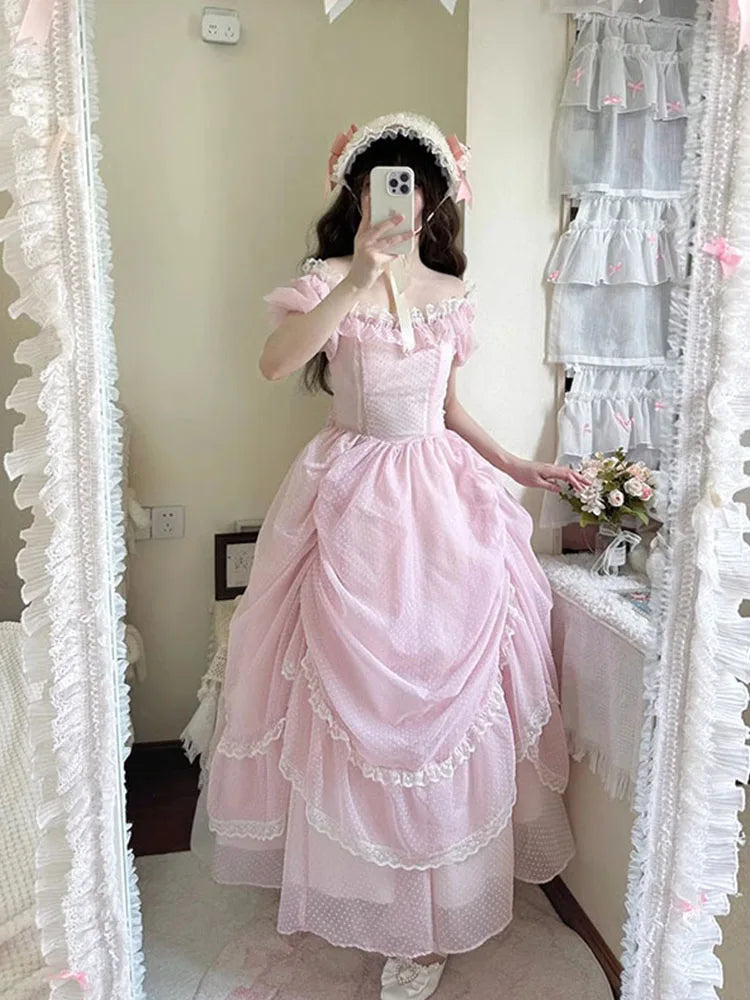 LIZAKOSHT - Gentle Pink Puff Sleeve Op Dress Floral Wedding Lolita Waist Slimming Bow Tail