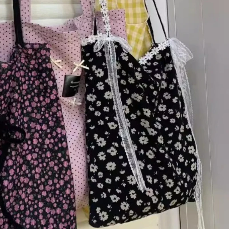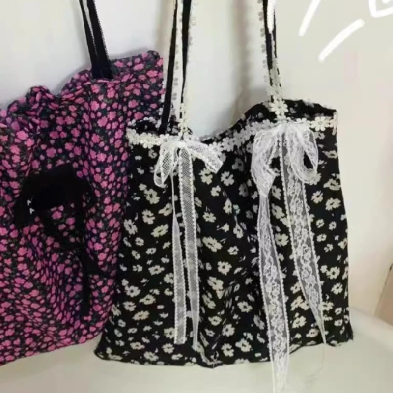 LIZAKOSHT - Girls Fairy Sweet Flower Print Women's Handbags Simple Ins Patchwork Lace Underarm Bag Fashion Y2k Aesthetic Shoulder Handbags