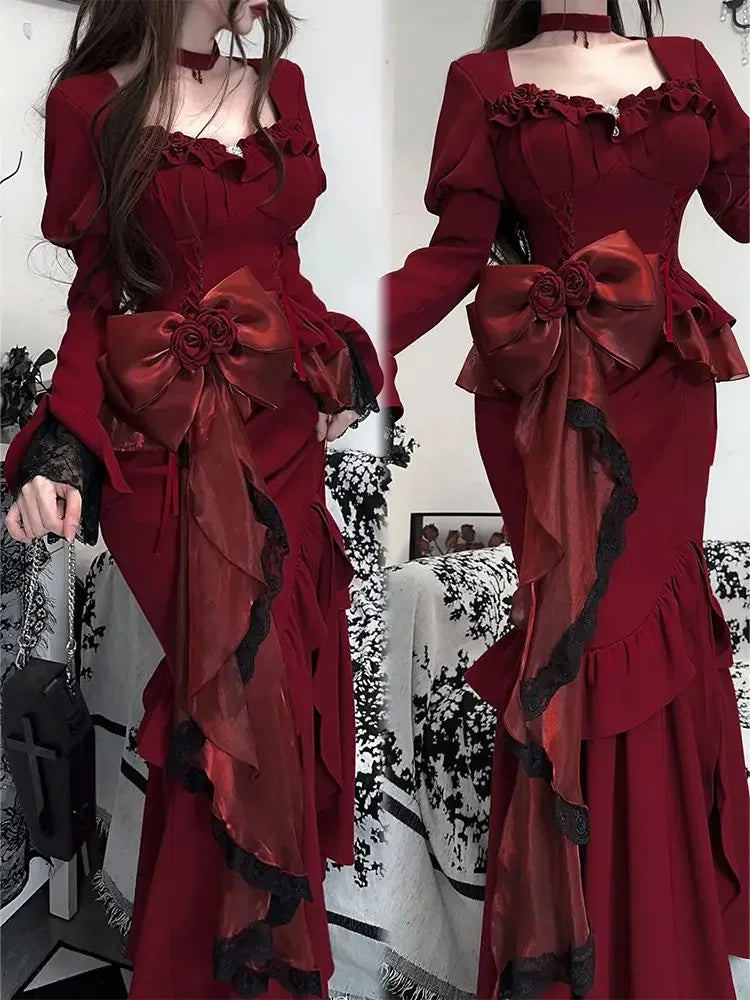 LIZAKOSHT  -  Gothic French Hepburn Style Retro Velvet Dress for Women's New Spring Design Y2K Dark Vintage Punk High Waist Long Dresses