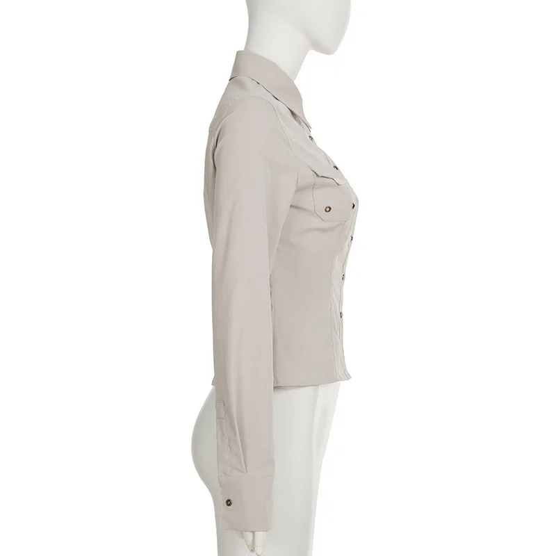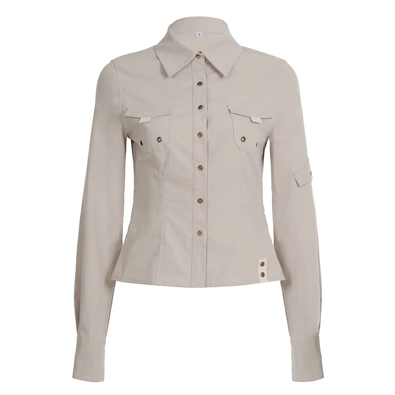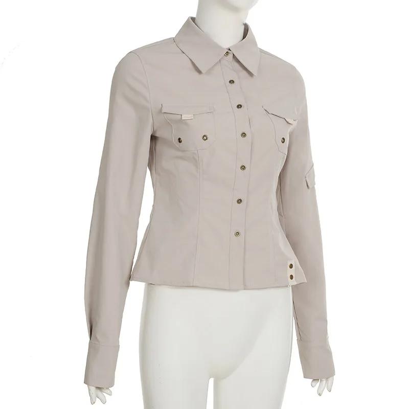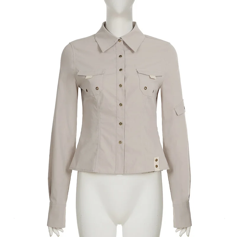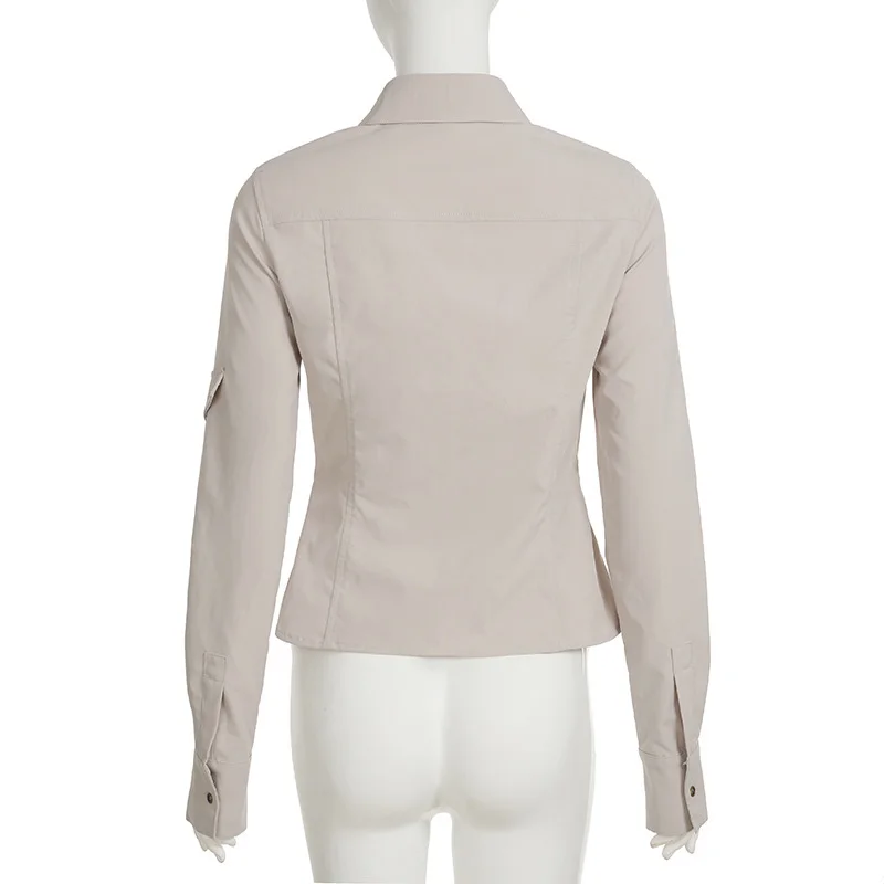 LIZAKOSHT - Harajuku Autumn Newly Pockets Flip Collar Buttons Long-sleeved Shirts Work Style Slimming Cardigant Top Blouses for Women