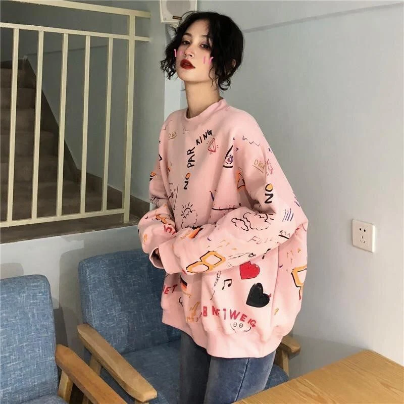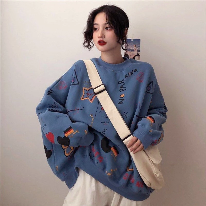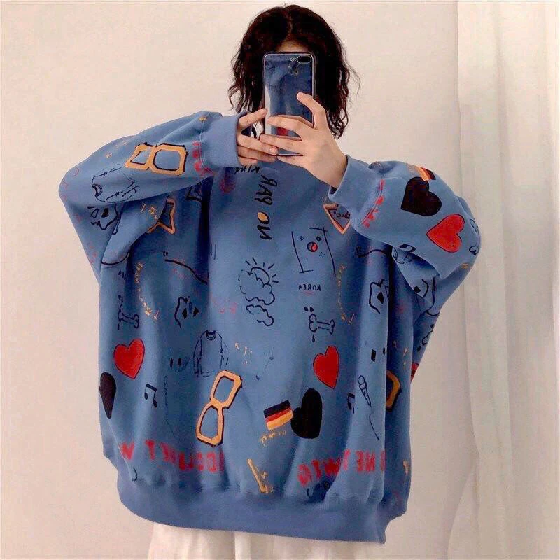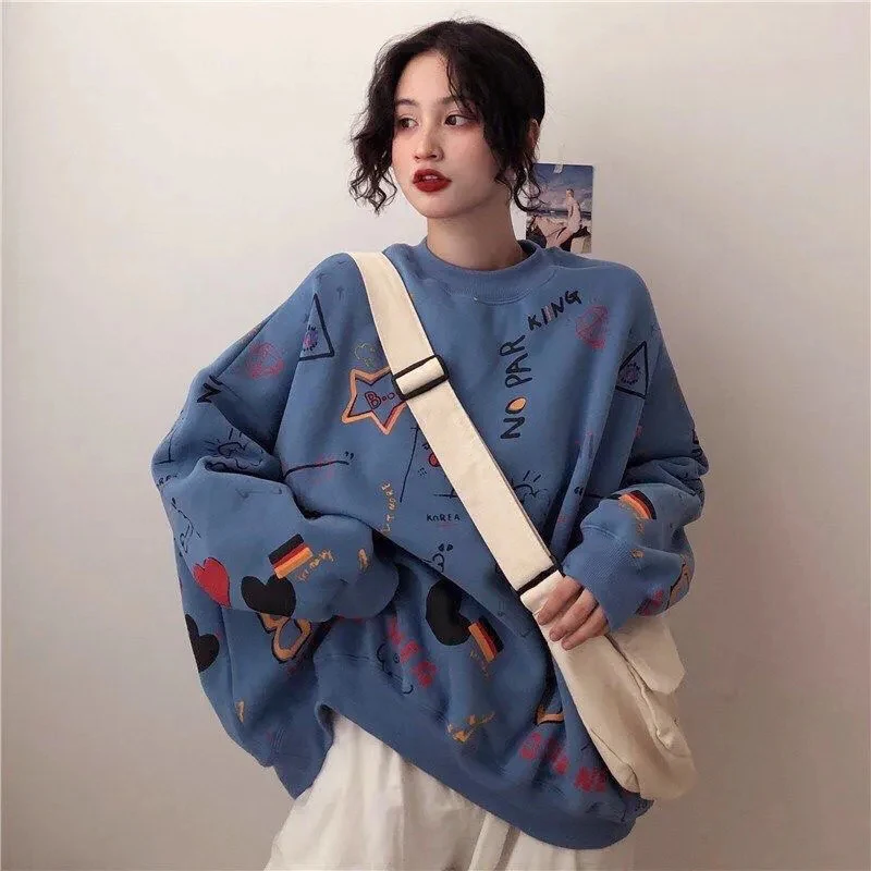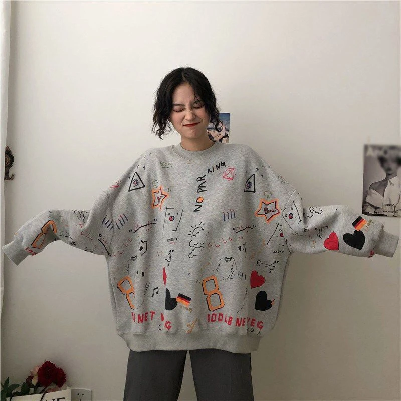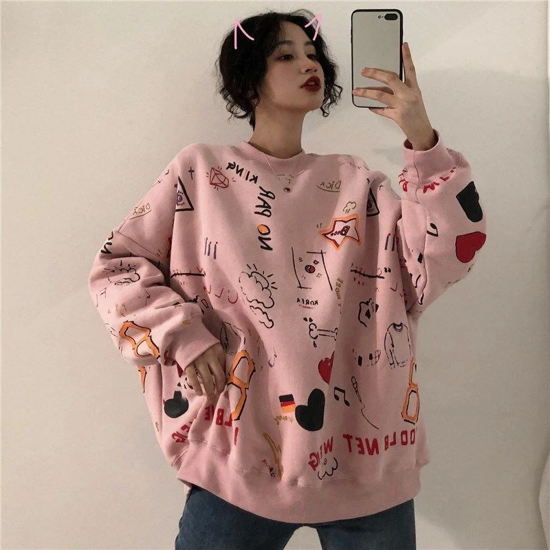 LIZAKOSHT  -  Harajuku Graffiti Women Sweatshirts Fall Winter Thick Vintage Sweet Preppy Pullovers Korean Loose Casual Print Long Sleeve Tops
