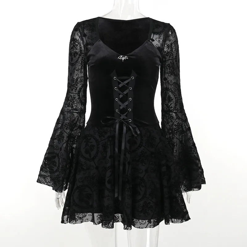 Lizakosht Harajuku Women's Vintage Gothic Long Sleeve Ruffle Mini Dress V Neck Velvet Stretchy Bodycon Cocktail Dresses Victorian Blouse