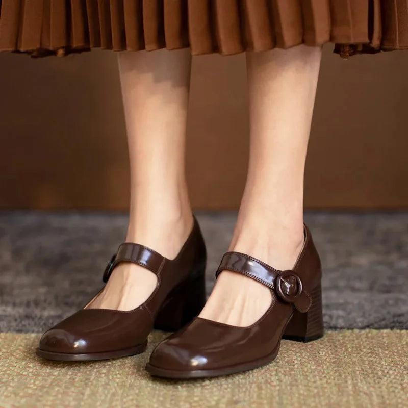 LIZAKOSHT High heels, chocolate colored single shoes, thick heels, college style, new comfortable retro Mary Jane shoes for wo