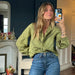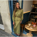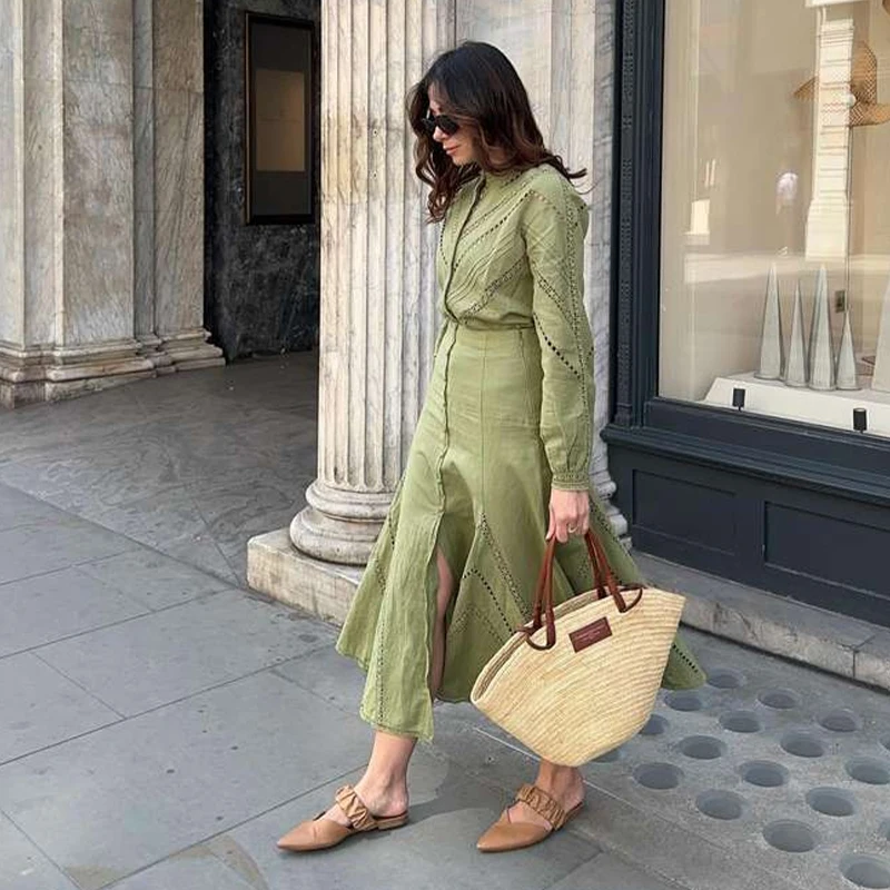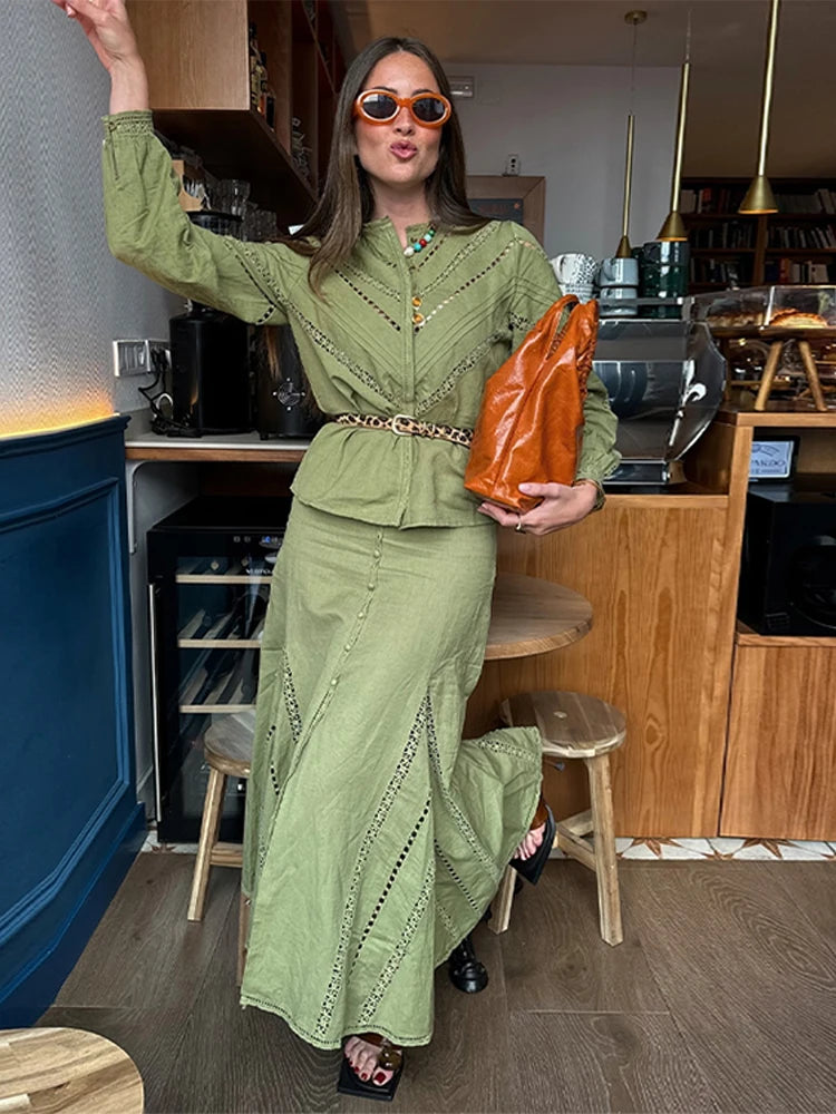 LIZAKOSHT - Hollow Out Green Long Skirt Set Embroidered Long Sleeved Shirt Single Breasted Elegant Half Body Fishtail Skirt Women's Clothing