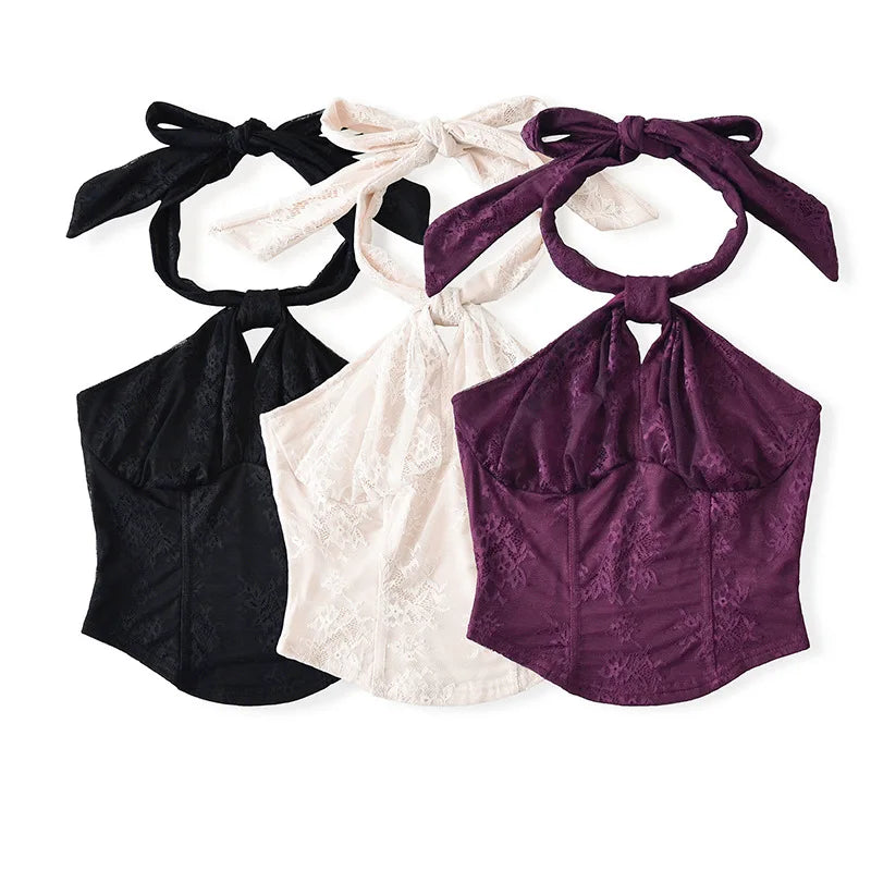 LIZAKOSHT  -  Hollow Tie Up Halter Printed Neck Solid Color Corset Top Summer 2025 Fashion Lace Streetwear Woman Elegant Sexy Tank Tops