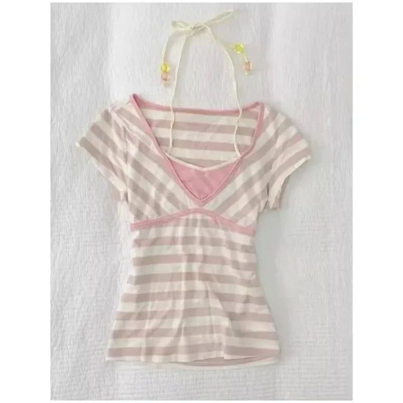 LIZAKOSHT - Japanese Subculture Fake Two Short-sleeved T-shirts Pink Striped Wide Necktie Tie Neck Women's Tees Y2k Sweet Spicy Slim Tops