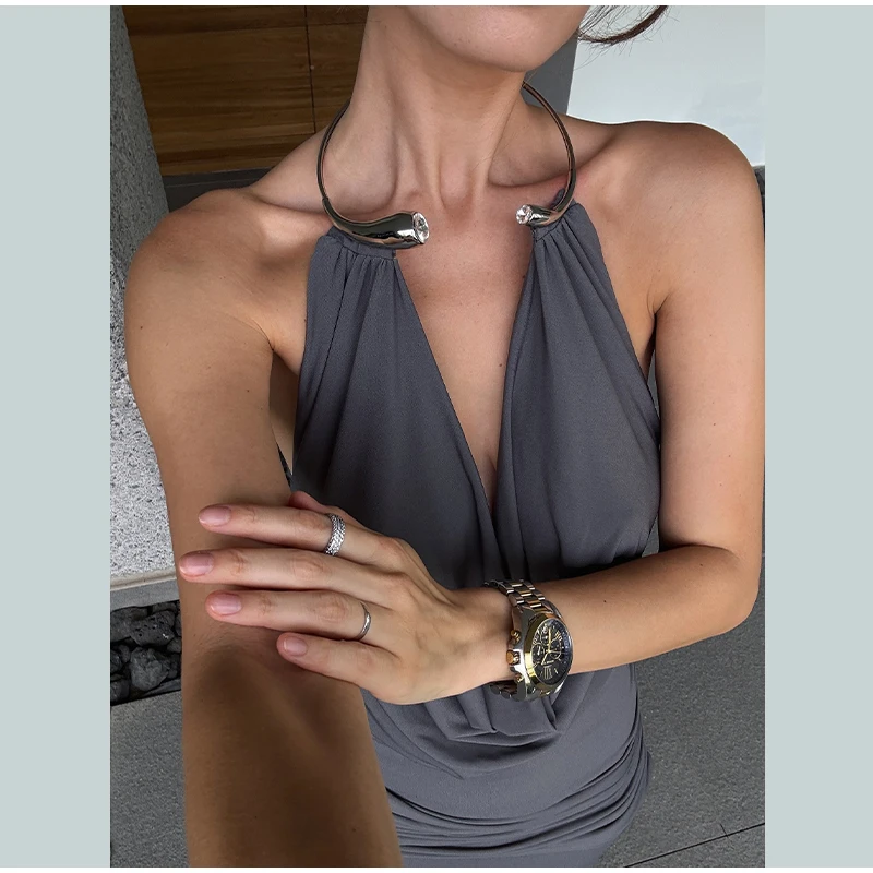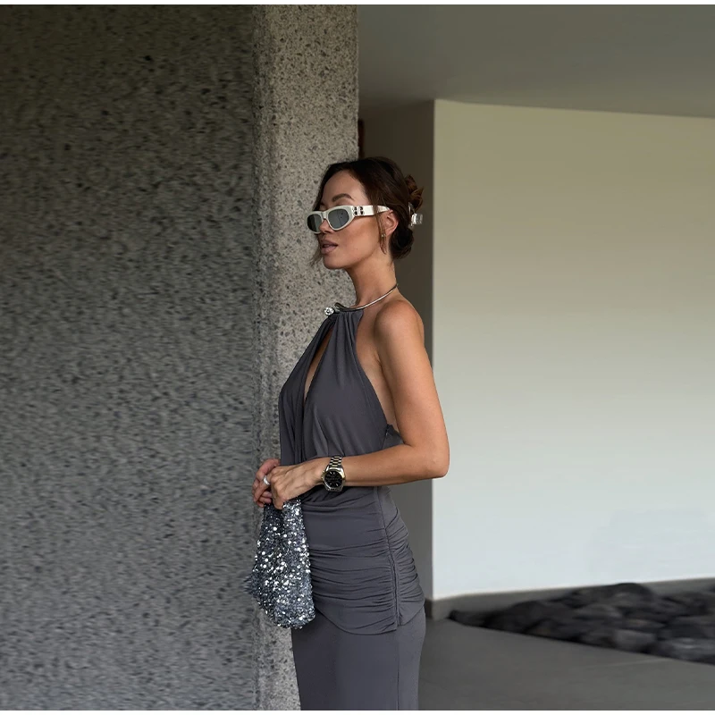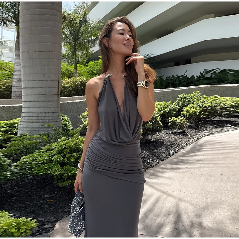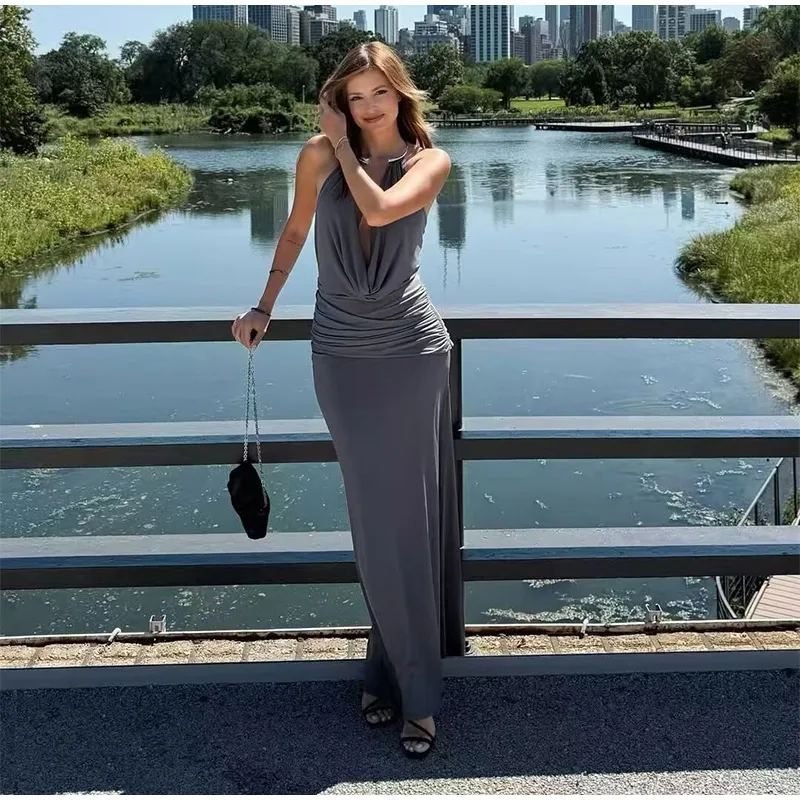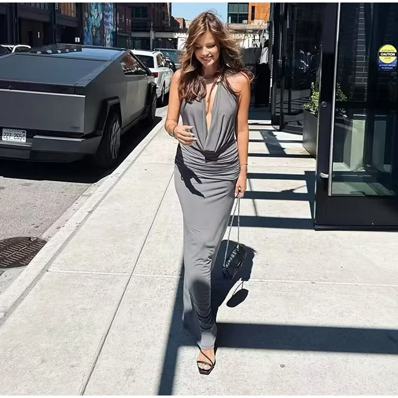 LIZAKOSHT - Jewelry Hanging Neck Long Dress Woman Solid Color Sleeveless Slim Backless Maxi Robes Sexy Fashion Women's New Vacation Dresses