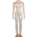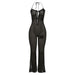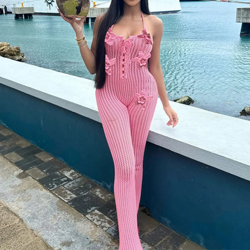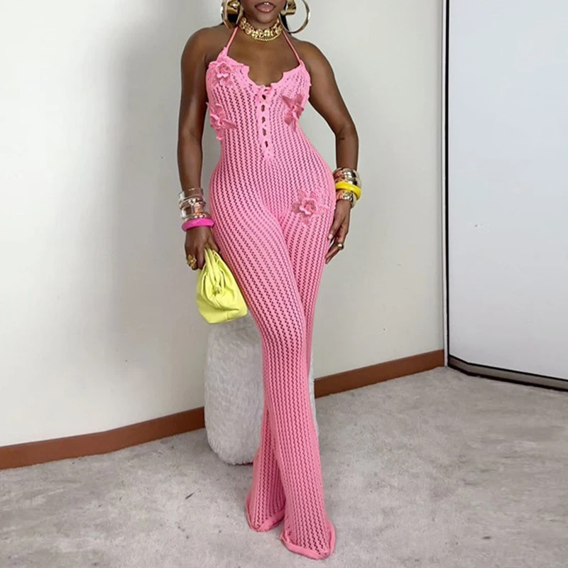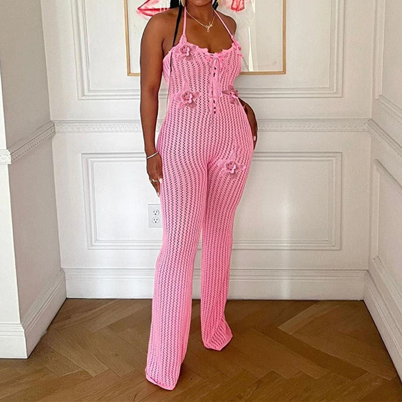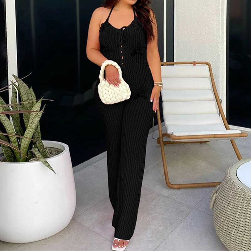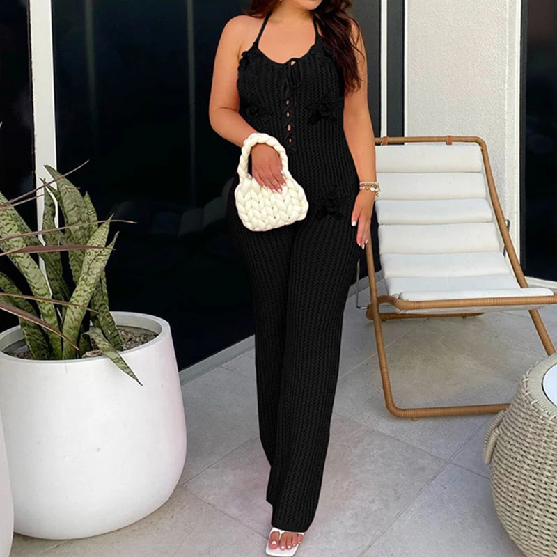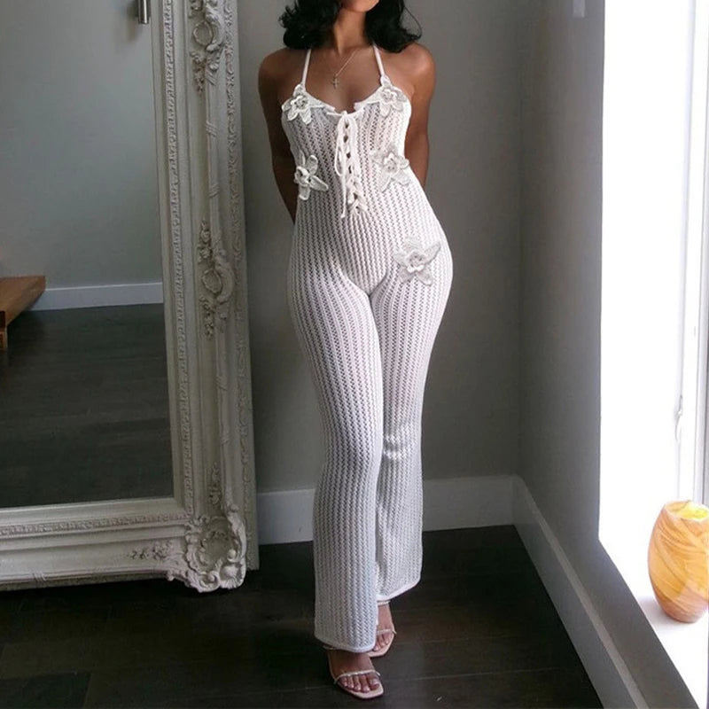 LIZAKOSHT  -  Knitted Halter High Elasticity See Through Halter Backless Solid Color Floral Appliques Club Street Low Cut Jumpsuit for Women