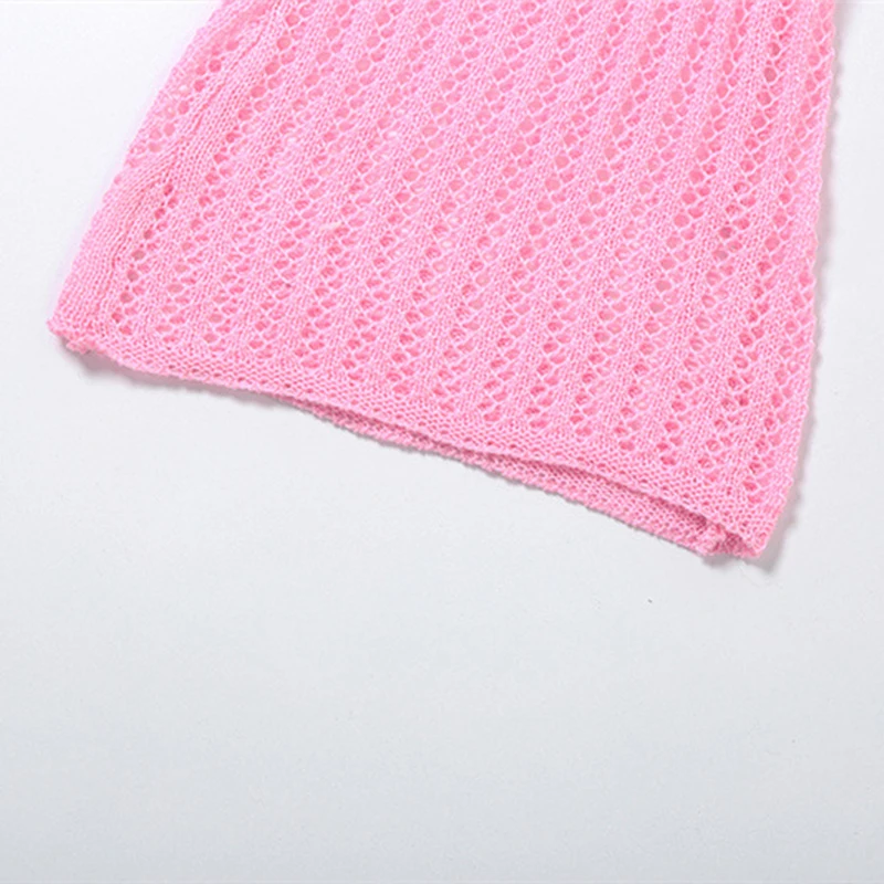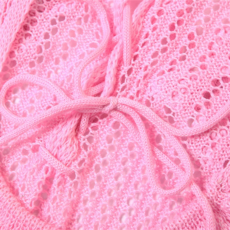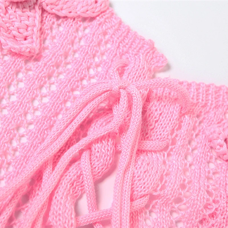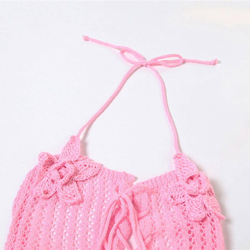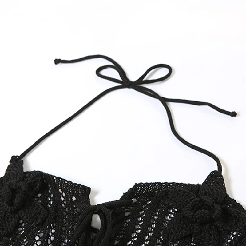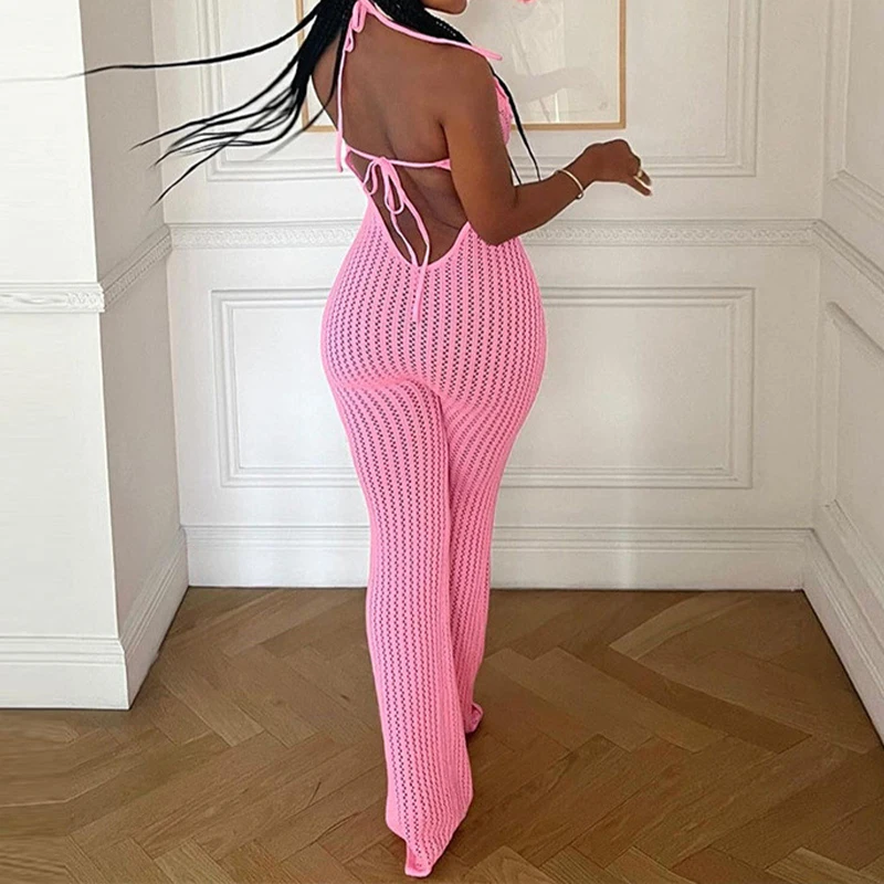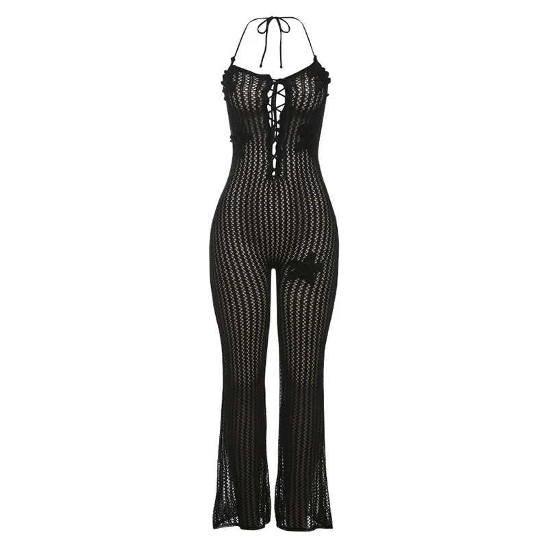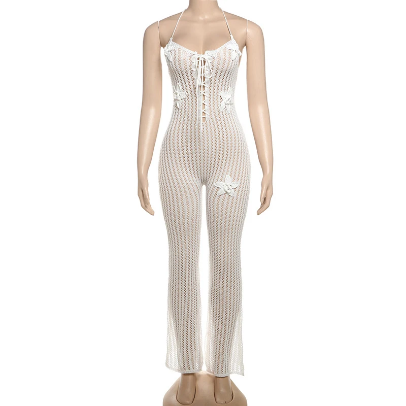 LIZAKOSHT - Knitted Halter High Elasticity See Through Halter Backless Solid Color Floral Appliques Club Street Low Cut Jumpsuit for Women