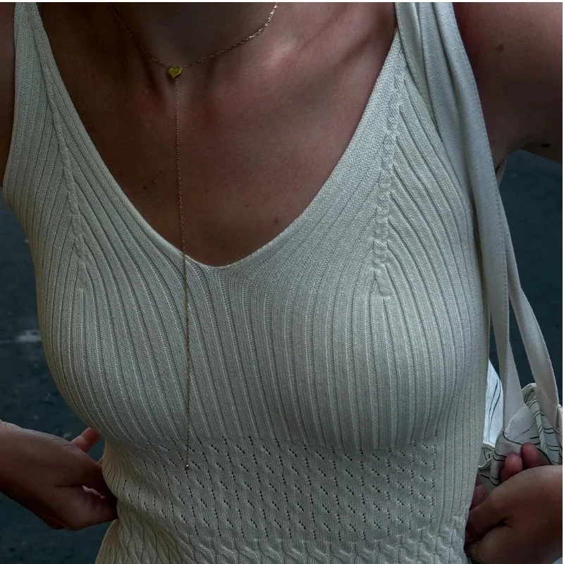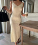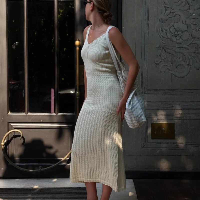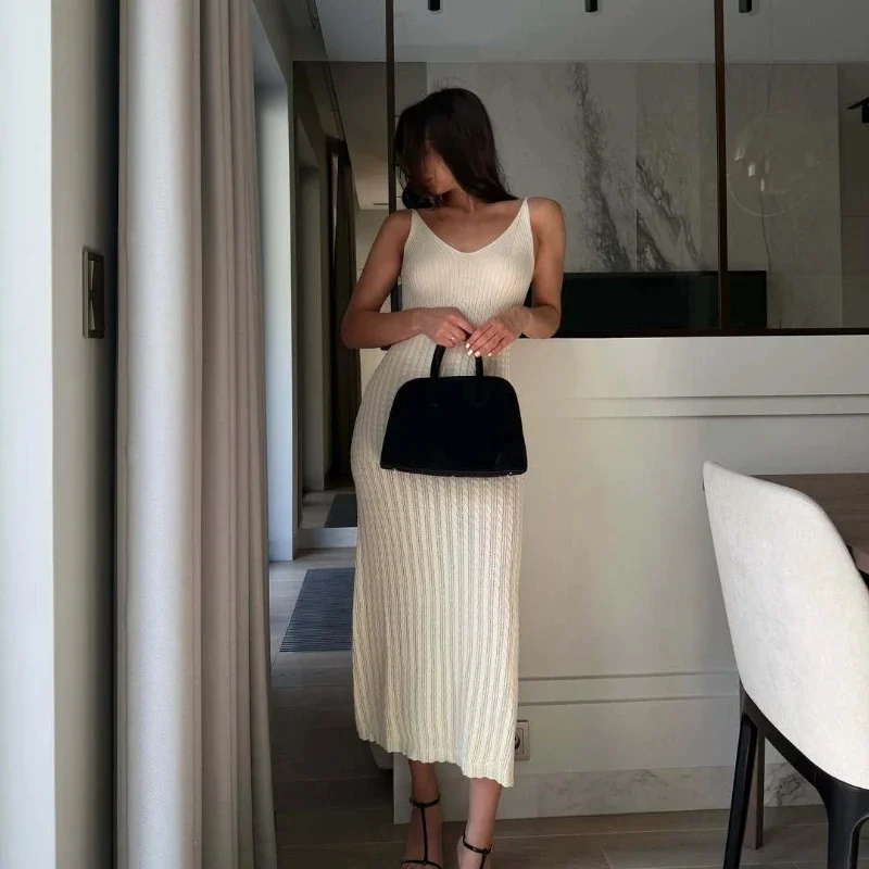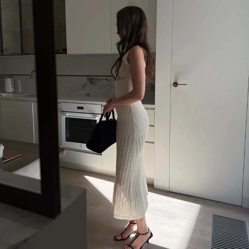 LIZAKOSHT - Knitted Tube Long Dress For Women Hollow Out V-neck Sleeveless Waist Cinching Slip Robe 2025 Autumn Elegant Female Party Dresses