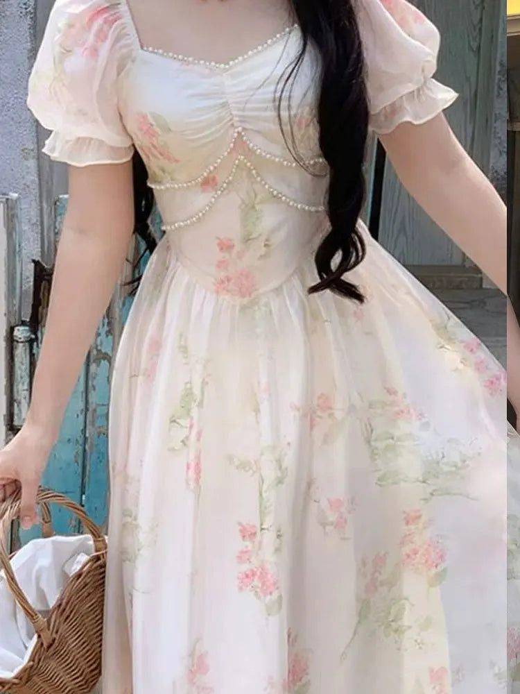 LIZAKOSHT - Korea Vintage Floral Print Dress Women Casual Square Collar Midi Dress Female Puff Sleeve Elegant Fairy Holiday Dress Vestido