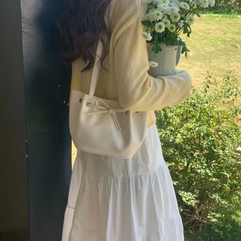 LIZAKOSHT - Korean Bow Drawstring Pu Leather Women Shoulder Bag Fashion All Match Bucket Bag Y2k Shopper Handbag Bolsos Para Mujer