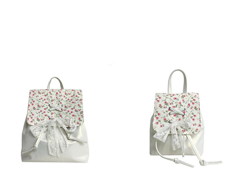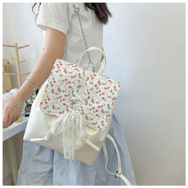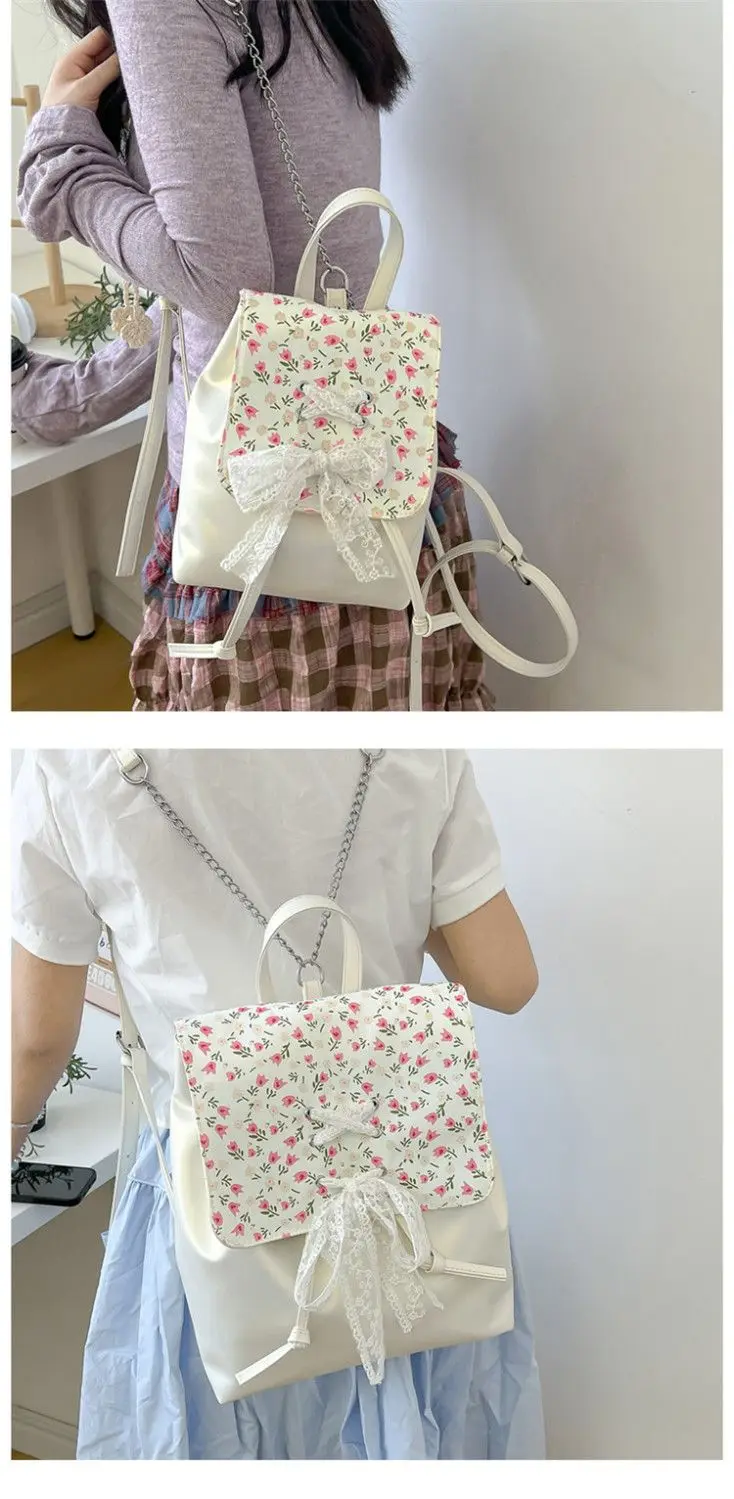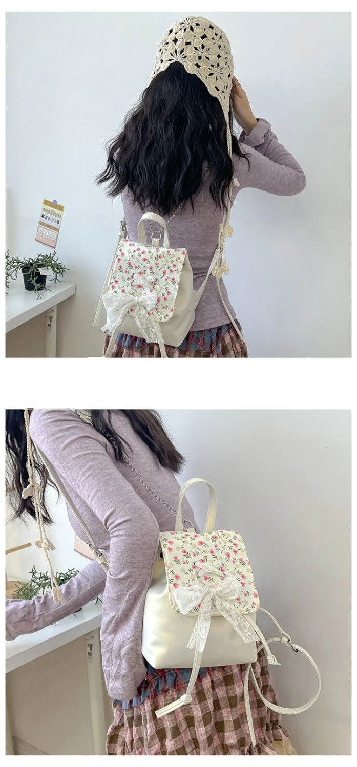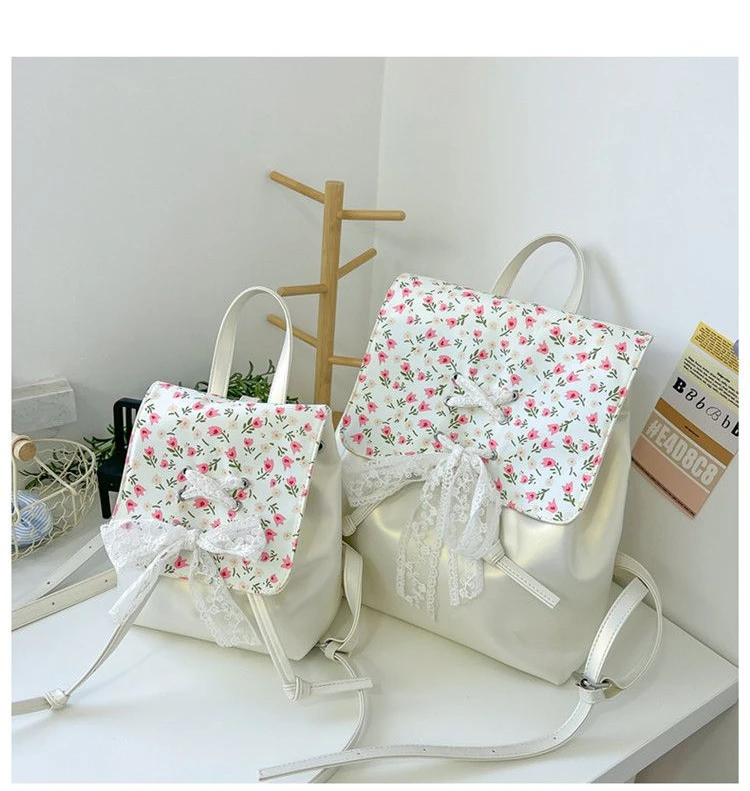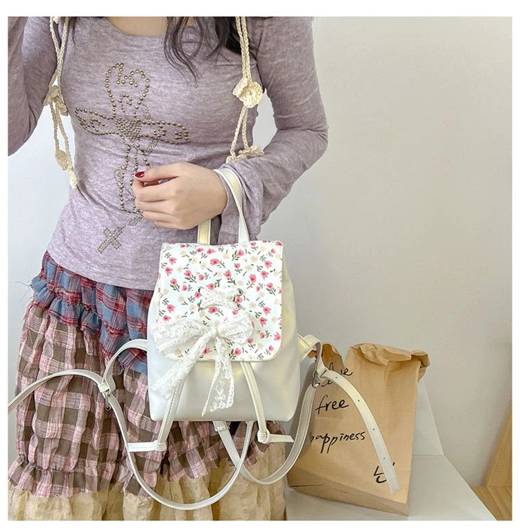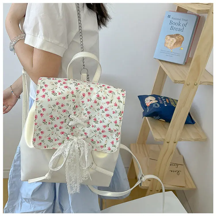 LIZAKOSHT  - Korean Girls Fashion Flower Print Backpack Women Students Kawaii Bow Bandage Schoolbags Sweet Y2k Aesthetic All Match Backpacks