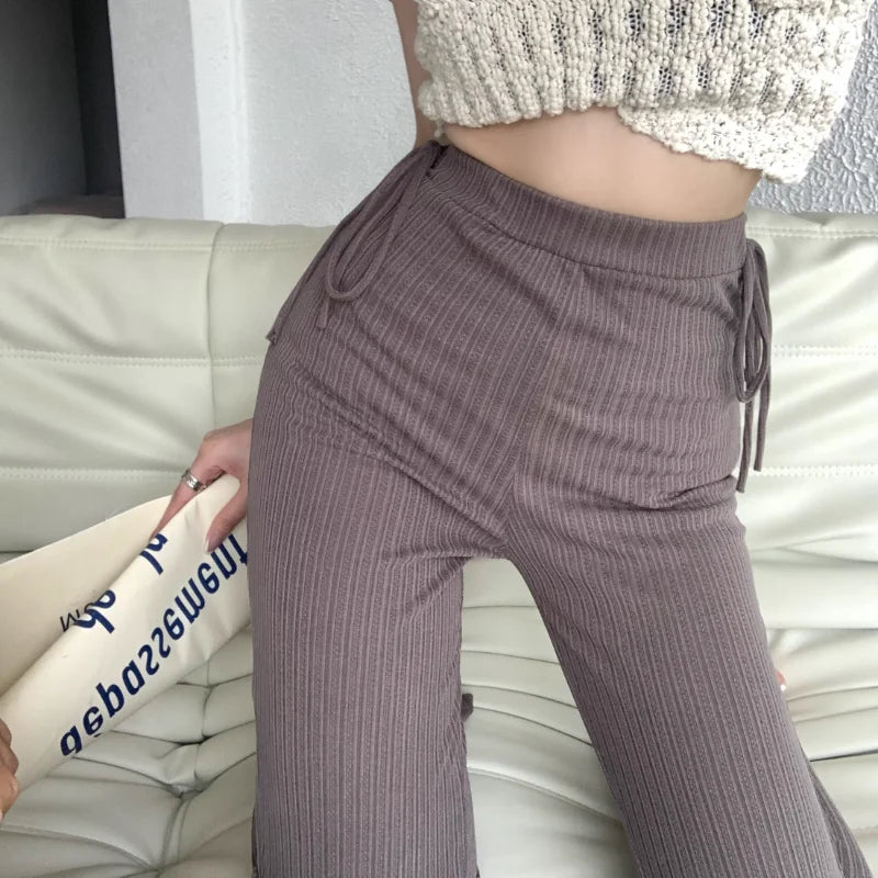 LIZAKOSHT - Korean Lace-up Pleated Solid Color Casual Pants Women Summer New High Street Sexy Slim Knitted Wide Leg Pants