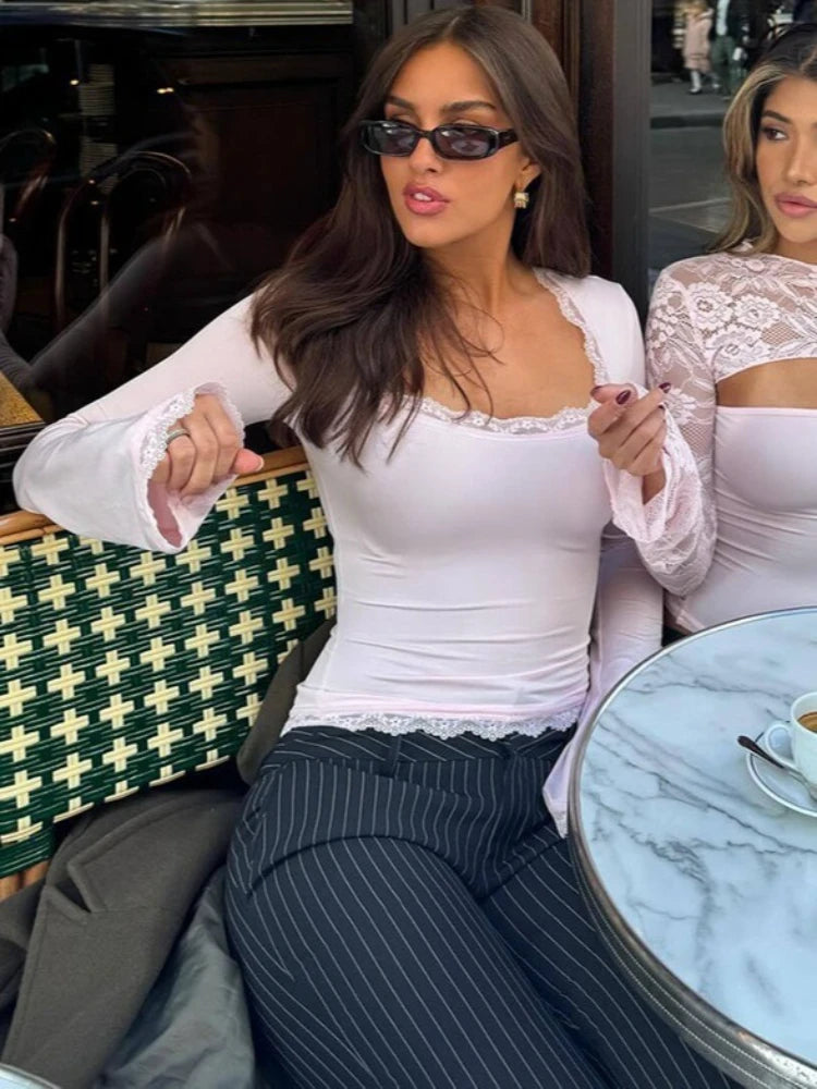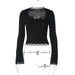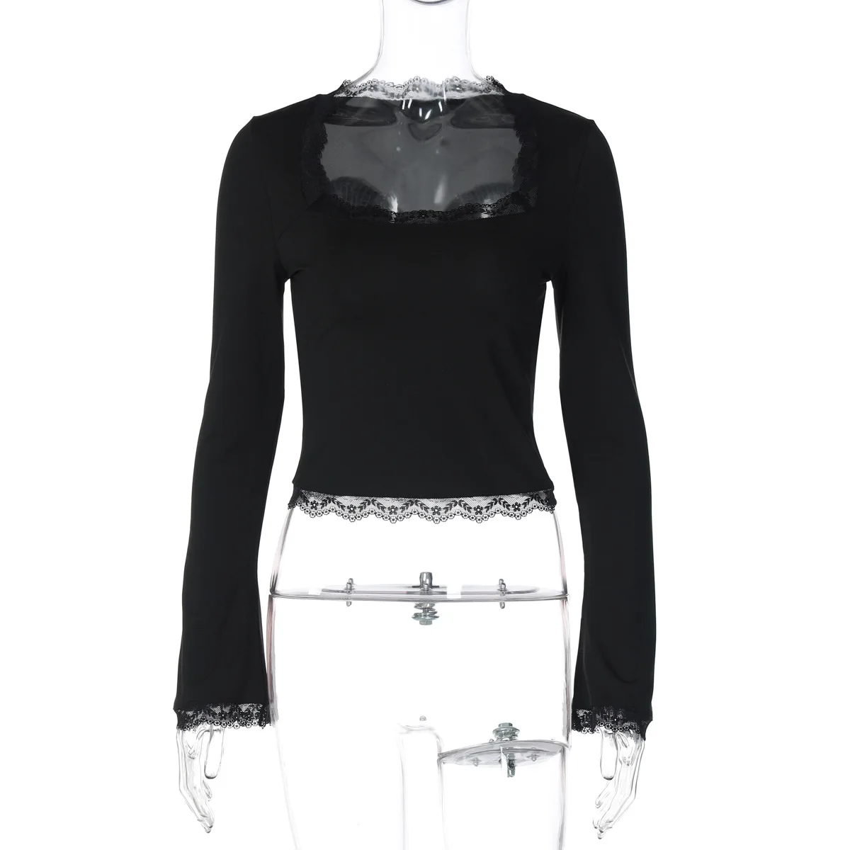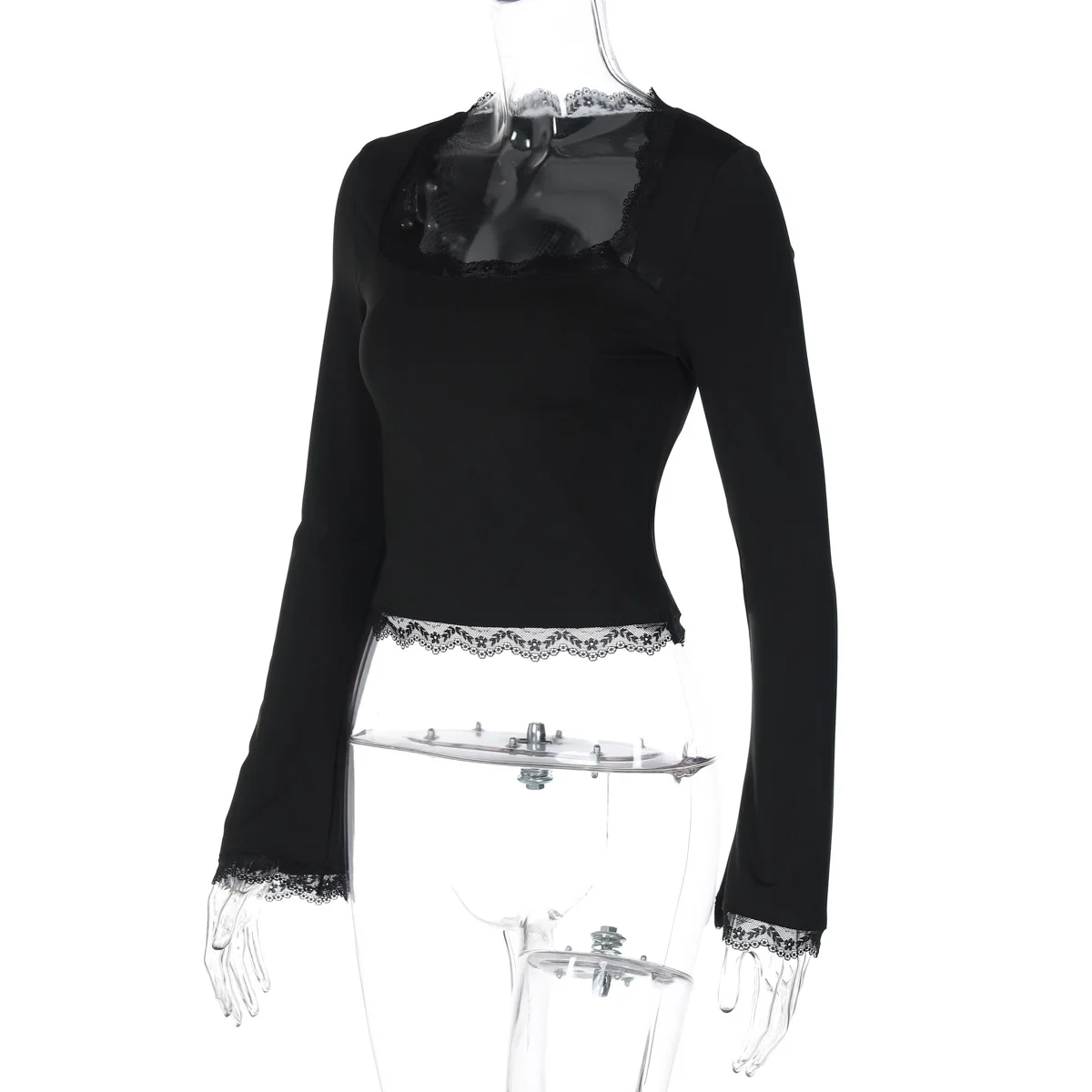 LIZAKOSHT  -  Lace Patchwork Long Sleeve T-shirts Streetwear Y2K Woman Clothes Casual Fashion Square Collar Slim Pink Tee Shirt Tops