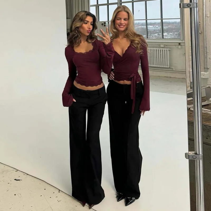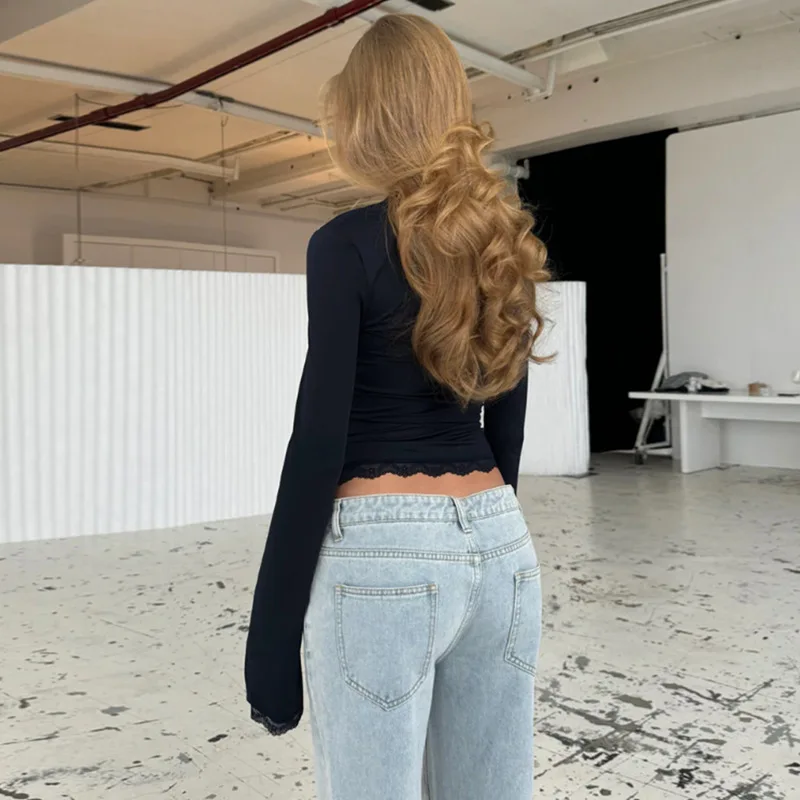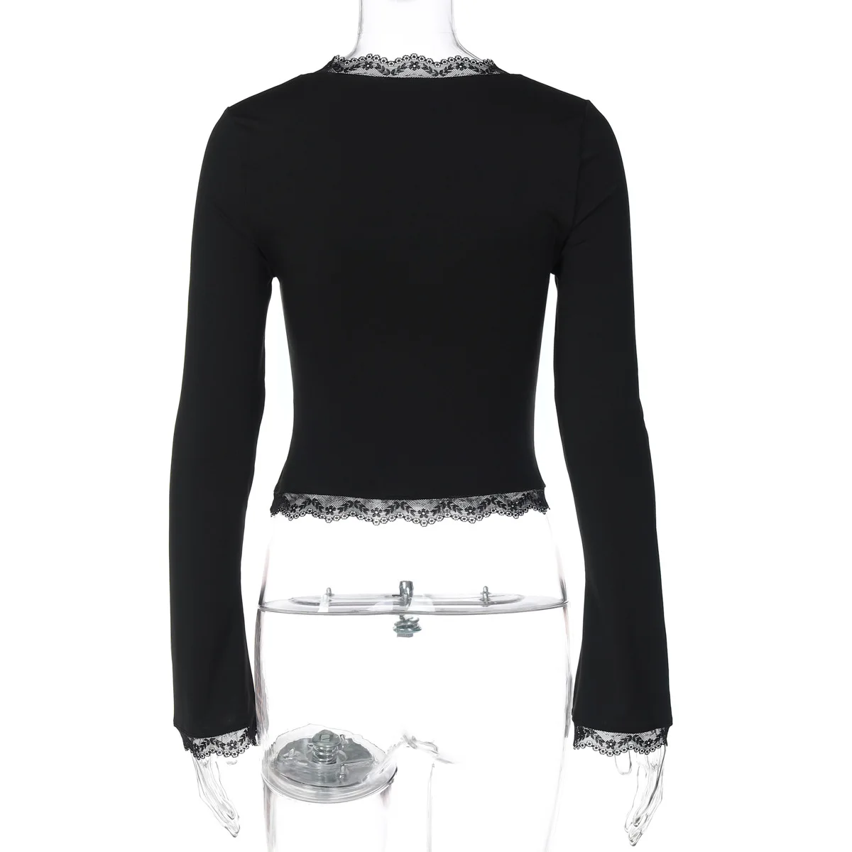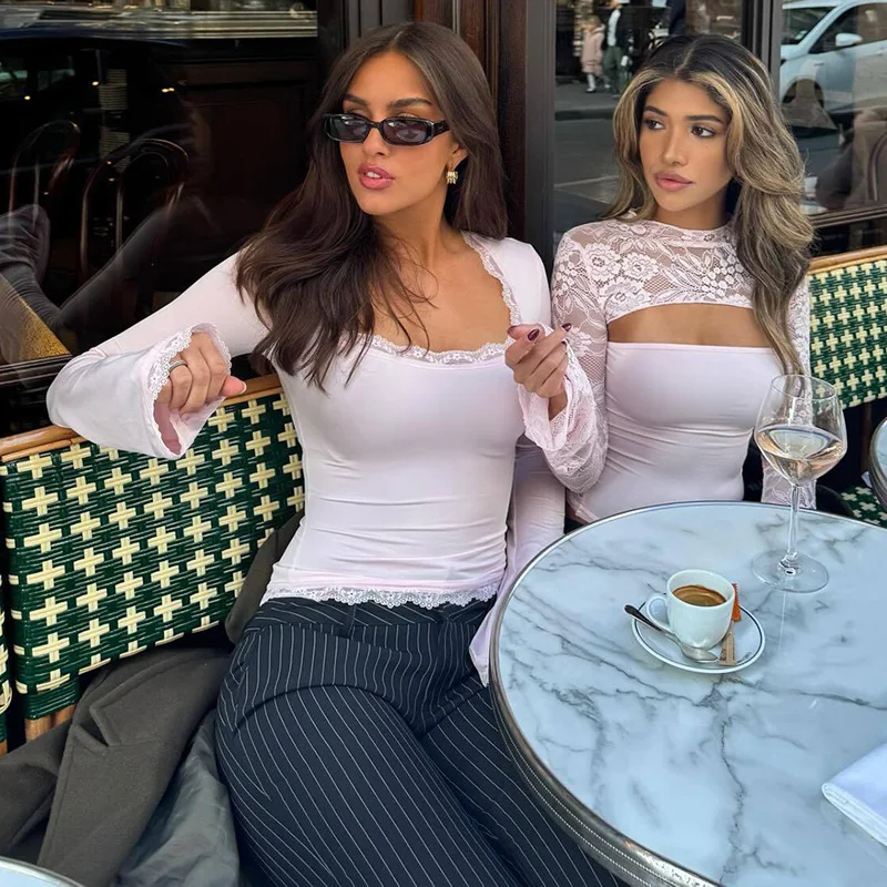 LIZAKOSHT  -  Lace Patchwork Long Sleeve T-shirts Streetwear Y2K Woman Clothes Casual Fashion Square Collar Slim Pink Tee Shirt Tops