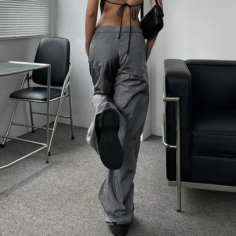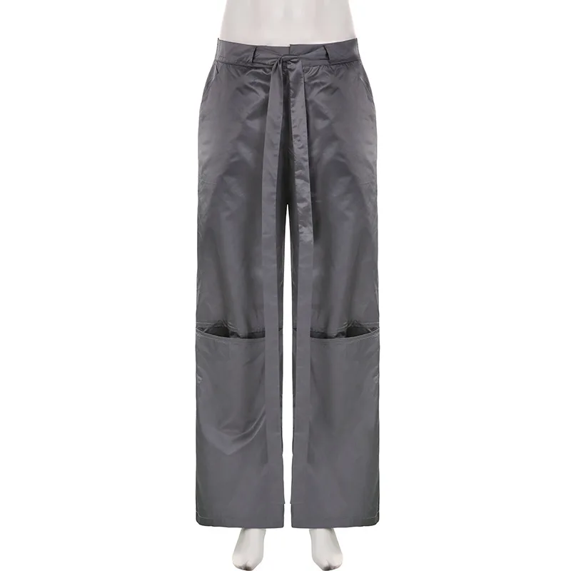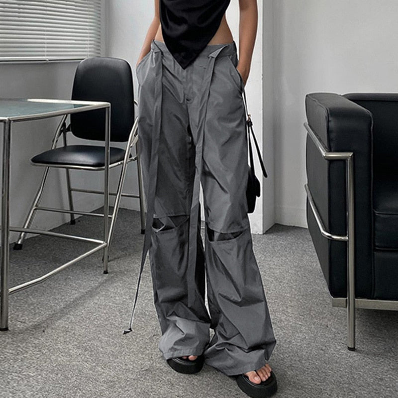 Lizakosht Lace-Up Baggy Y2k Cargo Pants Women Grey Straight Low Waist Hip Hop Parachute Trousers With Waistband BF Sweatpants Fashion