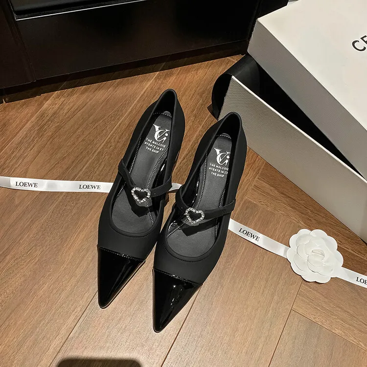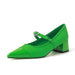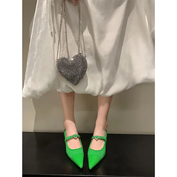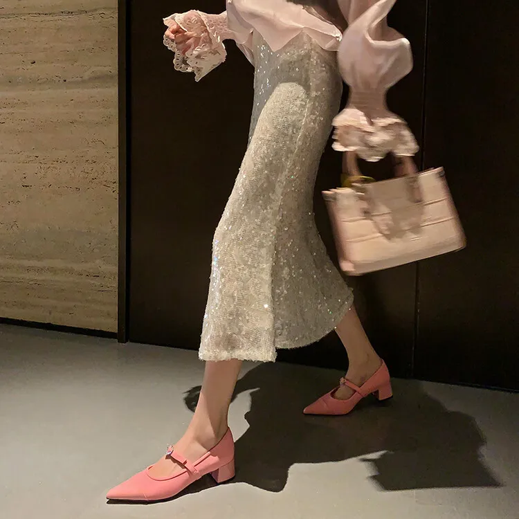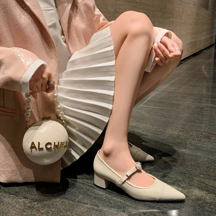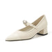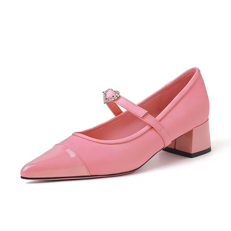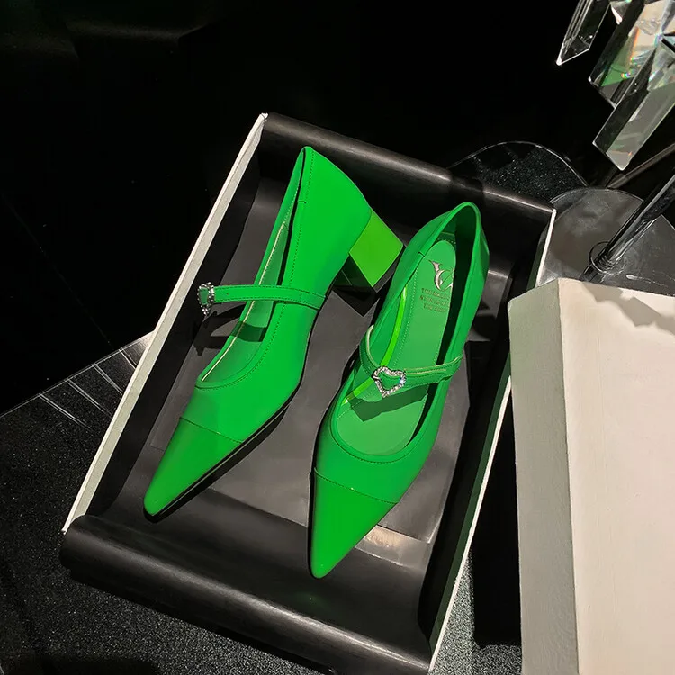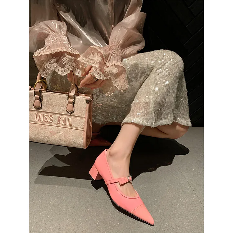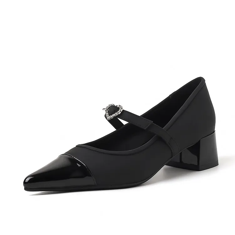 LIZAKOSHT - Leather Custom Rhinestone Metal Belt Buckle Mary Jane Women's Shoes Retro Pointed Square Heel Casual Shoes for Wedding Banquet