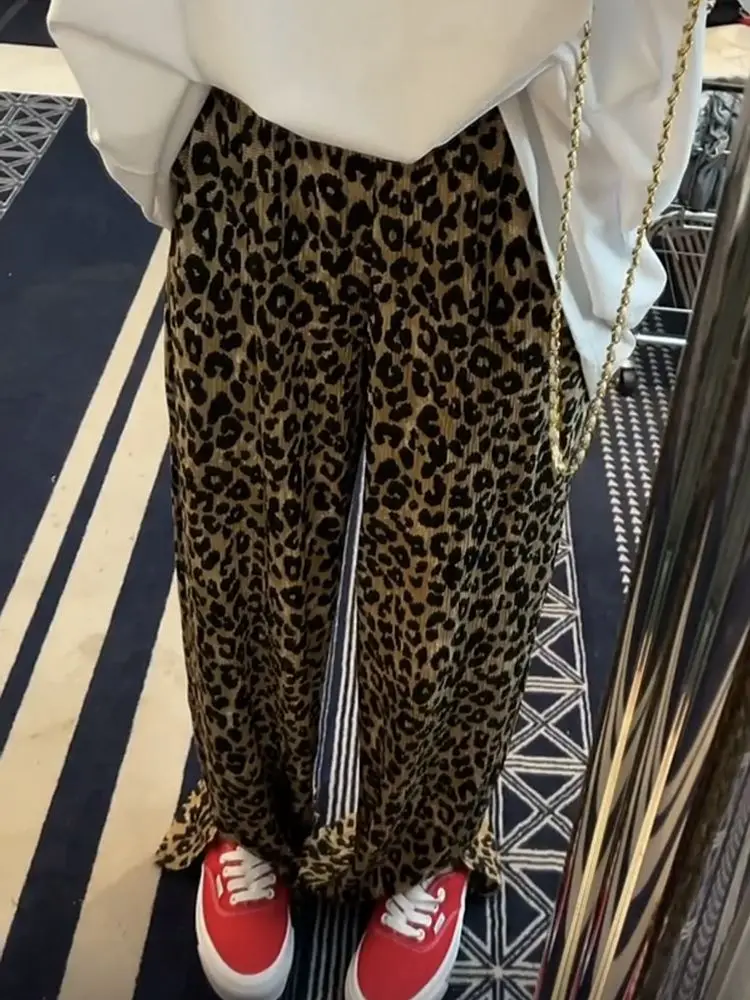 LIZAKOSHT - Leopard Print Slit High Waist Wide Leg Pants Fashion Street Loose Casual Pants Retro All-match Trousers Streetwear Women