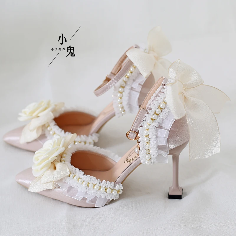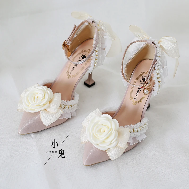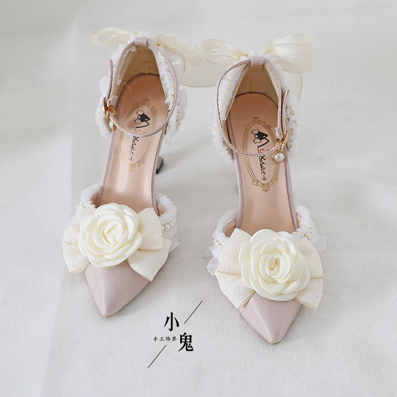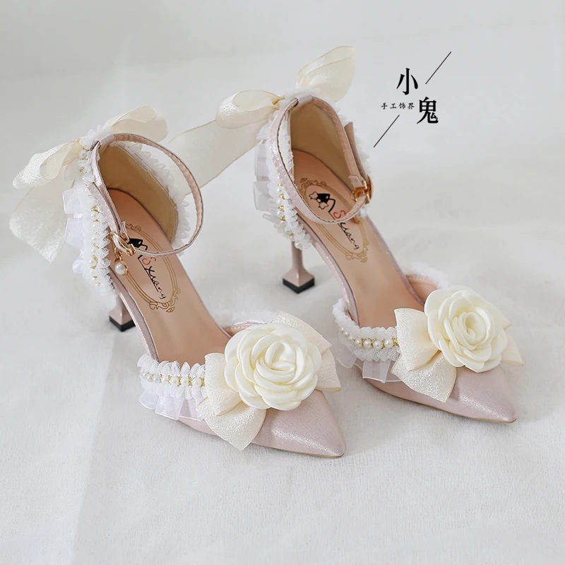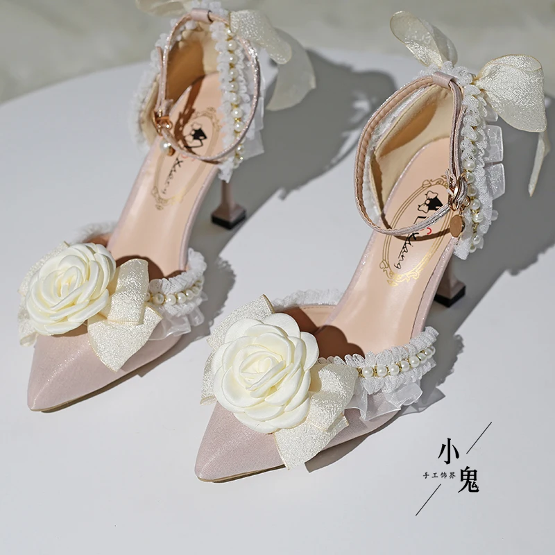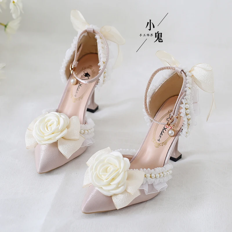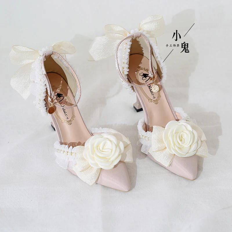 LIZAKOSHT - Lolita Elegant Camellia Lo Shoes Flower Wedding High Heels Sweet Sandals Bowtie Lace Lolita Girls Tea Party Single Shoes